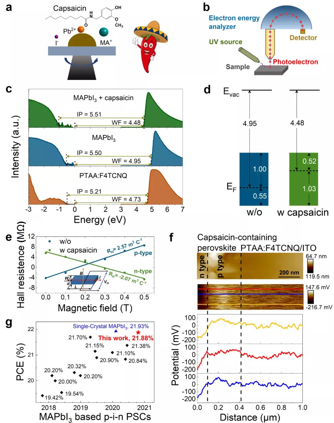 研究人员把天然分子辣椒素作为添加剂引入到钙钛矿半导体,利用自行设计、定制的高分辨、高精密光电子能谱原位分析系统发现钙钛矿半导体的表面电子结构经历了从原先的p型到n型的完全转变,霍尔效应测量进一步证实了这一新的现象。