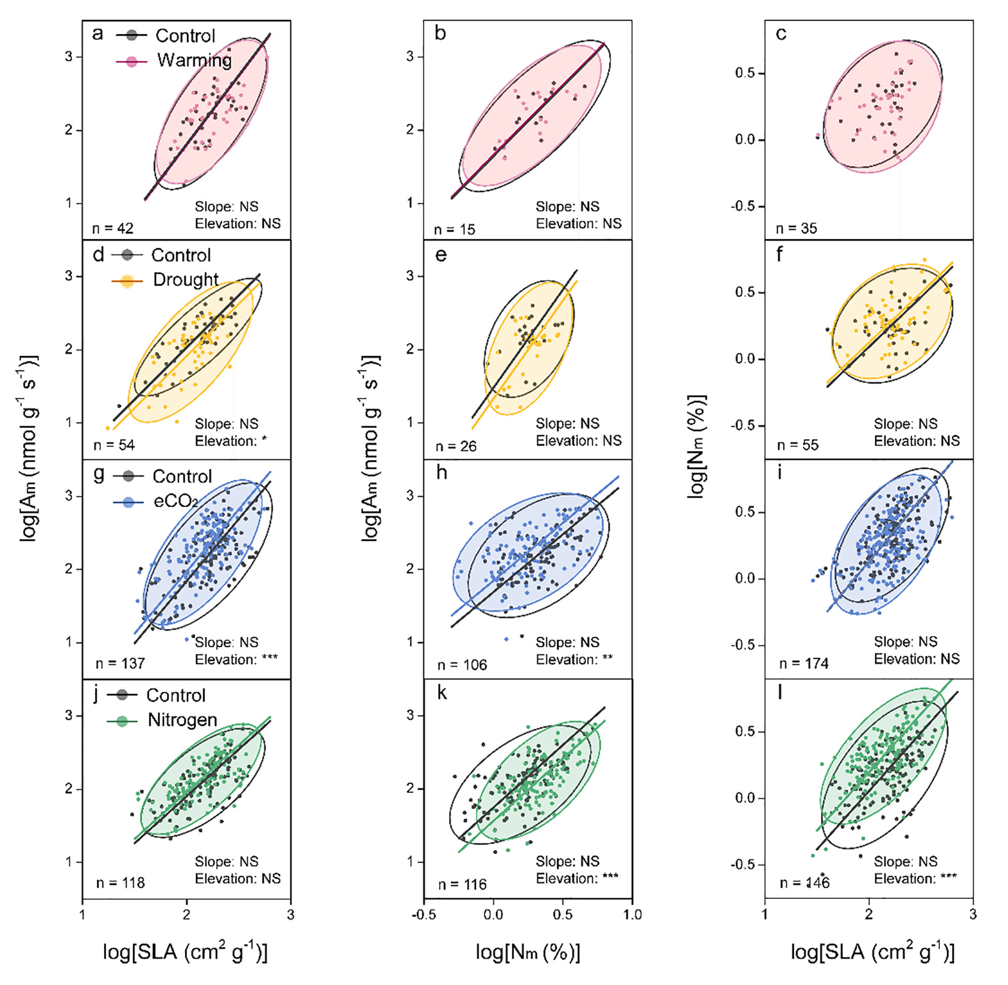 地球上现存约三十多万种维管束植物,它们在漫长的进化过程中呈现出丰富多样的生理生态学和形态学特征,并形成千姿百态的植物群落。由于这些特征能够反映植物对环境变化的响应与适应,并且影响植物个体与生态系统的功能,因此被定义为植物功能性状。叶片作为植物的光合作用器官,其功能性状(如寿命、氮含量与比叶面积等)在不同物种之间存在着巨大差异。Wright等(2004)首次发现全球的植物物种在叶片功能性状间存在稳定的权衡关系,并将其定义为“叶片经济型谱”。基于叶片经济型谱,生态学家们陆续尝试利用植物功能性状的协同变化,优化光合作用的模拟机制,以期改进全球碳循环模型对生态系统生产力响应未来全球环境变化的预测能力。然而,这些科学尝试引出了一个新的生态学问题,即植物物种之间的功能性状权衡关系是否在全球环境变化下依然保持稳健性?该研究团队系统地分析了全球210个生态学实验中515个植物物种的叶片功能性状观测数据,发现物种间成对性状对增温、干旱、CO2富集和氮素添加的响应方向存在较大差异,并且大部分不遵循叶片经济型谱的指示方向(图1)。然而,物种之间的叶片功能性状权衡关系在环境变化下维持较高的稳健性(图2)。该研究成果以“Robust leaf trait relationships across species under global environmental changes”为题发表在《Nature Communications》期刊。