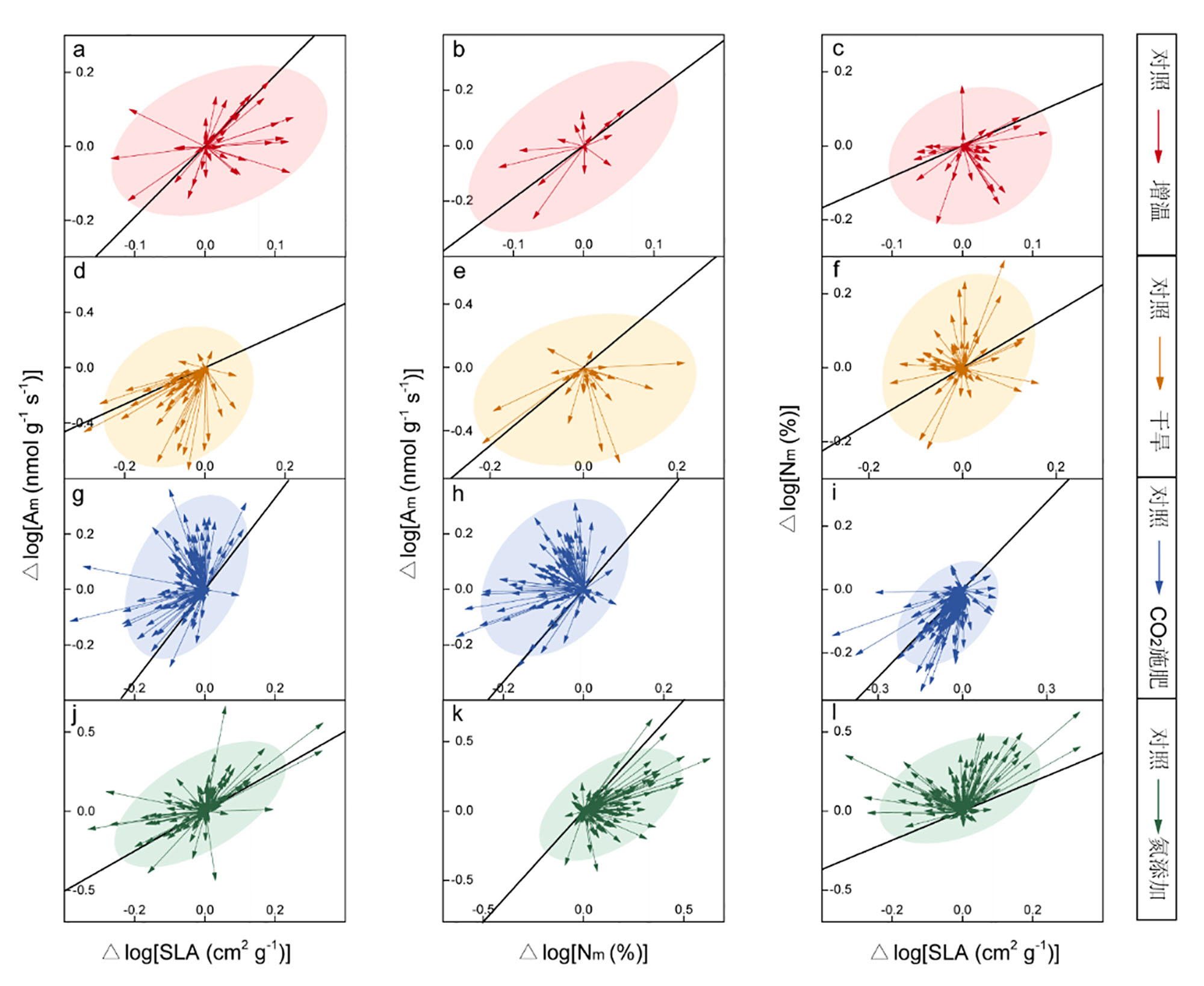 图1 植物物种的叶片成对功能性状对环境变化的响应差异,图中黑色实线代表叶片经济型谱的指示方向