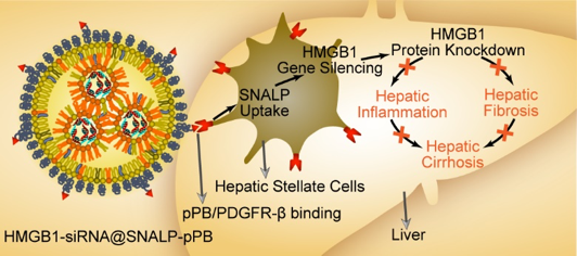 针对在肝硬化疾病发展中发挥关键作用的纤维化和炎症问题,俞磊教授和闫志强副研究员课题组发展了基于抗纤维化和抗炎症双重作用的肝靶向小核酸脂质纳米粒递送系统,成功应用于动物模型肝硬化疾病的治疗。以往对肝硬化治疗的主要策略集中在如何降低肝纤维化程度,而忽略了其关键促进因素——肝脏炎症。高迁移率族蛋白B1(HMGB1)是一种促炎症因子和成纤维细胞趋化因子,能促进肝星状细胞增殖和肝纤维化发展,在肝硬化形成中起关键作用。为此,在前期核酸药物递送平台基础上,课题组研发了一种靶向多肽修饰的负载HMGB1的小干扰RNA(siRNA)的脂质纳米粒,可在多肽介导下实现对肝星状细胞的靶向递送,有效抑制HMGB1基因表达,抑制肝星状细胞的活化和增殖,减少HMGB1蛋白释放,减轻肝脏炎症并抑制肝脏内胶原沉积和纤维化形成。研究结果表明,该策略可显著延长肝硬化小鼠动物模型的存活时间并显示了良好的生物安全性。高剂量组纳米粒可将肝脏纤维化程度和HMGB1蛋白水平降低至正常水平,显示出对肝硬化良好的治疗潜力。本研究从动物水平阐明了在肝硬化治疗中除肝纤维化外肝脏炎症的关键作用,且为肝硬化治疗提供了一种基于抗纤维化和抗炎症双重作用的靶向基因递送系统,为今后肝硬化的基因治疗提供了一种新的策略,相关成果发表在纳米研究领域顶级期刊ACS NANO(2020, 14, 6305)上。(阅读原文:doi.org/10.1021/acsnano.0c02633)