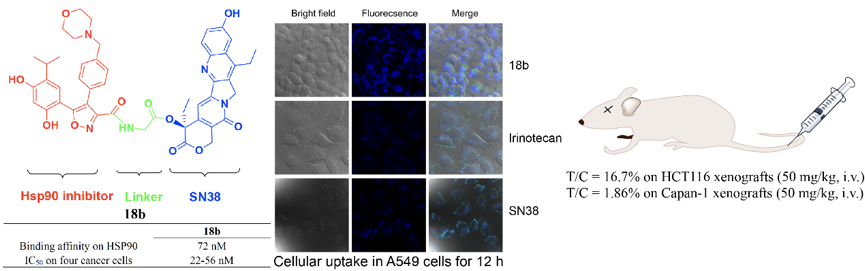 肿瘤化疗药物具有广谱的有效性,但对正常细胞、免疫细胞和肿瘤细胞缺乏选择性,容易产生系统毒性,大大限制了其广泛应用。针对化疗药物的毒性大、选择性低等科学问题,在前期对肿瘤细胞分泌胞外HSP90的肿瘤靶向性研究基础上,吕伟教授课题组发展了一种新型的基于eHSP90的微型药物偶联体系。课题组将HSP90抑制剂和肿瘤药物偶联,得到了高活性低毒性的候选化合物并利用eHSP90的内化作用,实现了肿瘤药物在肿瘤组织中的蓄积和释放。动物体内研究发现,该微型药物偶联体对胰腺癌具有优异的治疗效果。相较于抗体药物偶联物和小分子配体药物偶联物,该种微型药物偶联物合成方便、亲和力高,为解决化疗药物的毒性大、选择性低等问题提供了一种新方案,应用前景广阔。相关成果发表在药物化学顶级期刊Journal of Medicinal Chemistry(2020, 53, 5421)上,博士生朱书雷为论文第一作者。(阅读原文: