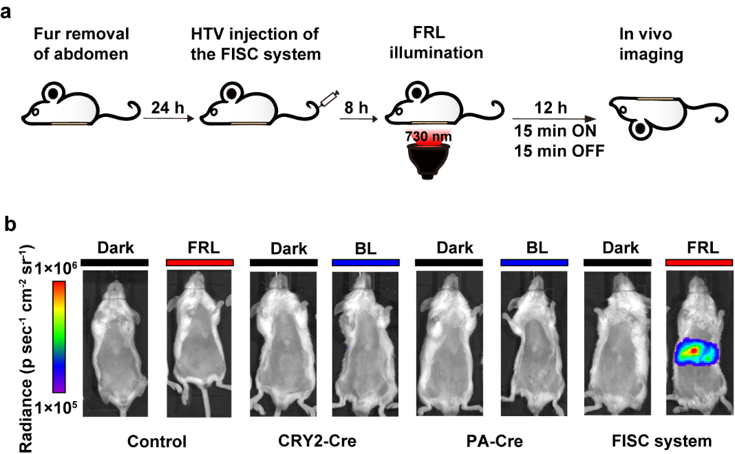 Cre-loxP重组酶系统在拟南芥、水稻、果蝇、斑马鱼、小鼠等多种高等真核生物体内均被广泛应用。这里,研究人员在小鼠体内测试了FISC系统的工作情况。利用流体动力学注射和电刺激两种不同方法将FISC系统递送至小鼠体内,同时与已发表的两套蓝光调控Cre-loxP系统进行比较,结果显示FISC系统在体内展现出更高效的重组效率,这也充分体现了远红光的组织穿透性优势,进一步证明了FISC系统在动物体内极具应用优势(图2)。