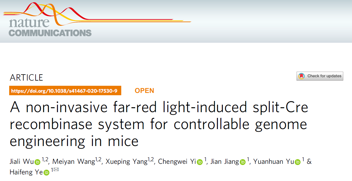 继7月10日在Science Advances 上发表远红光调控的分割型split-Cas9基因编辑系统后,7月24日,完美网页版生命科学学院,完美网页版医学合成生物学研究中心叶海峰研究员团队再次在Nature Communications上发表题为“A non-invasive far-red light-induced split-Cre recombinase system for controllable genome engineering in mice”的最新研究成果,利用光遗传学与合成生物学理念设计开发了一套远红光调控的分割型Cre-loxP重组酶系统(简称FISC系统)。该研究成果是继远红光控制细胞命运(FACE系统),远红光控制基因编辑后(FAST系统)的又一大重要应用,极大地拓宽了光遗传学的应用领域。