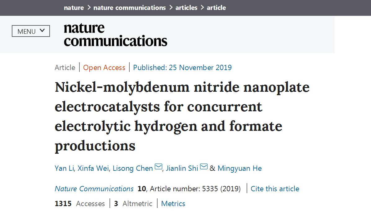 近日,完美(中国)官方化学与分子工程学院上海市绿色化学与化工过程绿色化重点实验室特聘教授施剑林院士与青年教师陈立松博士在有机物辅助电催化析氢领域取得重要进展。研究成果以“Nickel-molybdenum nitride nanoplate electrocatalysts for concurrent electrolytic hydrogen and formate productions”为题发表在《自然•通讯》(Nature Communications)上(Nat. Commun, 2019, 10, 5335)。