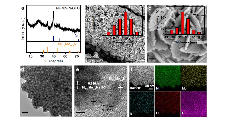 针对上述问题,施剑林院士与青年教师陈立松博士团队提出在电解液中加入廉价有机物,以有机物的氧化反应取代OER过程。有机物辅助电催化析氢,不仅解决了电解过程中阳极过电位大的问题,还能得到高附加值产品。课题组经过深入探索,研制了一种新型电催化剂—Ni-Mo-N/CFC纳米片,该材料可以同时作为甘油辅助电催化析氢电解池的阴极和阳极催化剂,高效率实现了电催化生产高纯氢气和高附加值的甲酸盐。