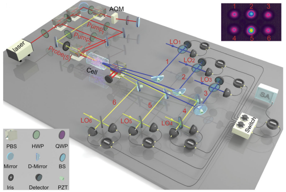 通常多体量子纠缠的产生需要很复杂的光学分束系统,严重限制方案的可扩展性。目前国际上最新的研究趋势是通过频率和时间复用将多个非线性过程集成到一个简单的装置。但该方案产生的多体纠缠在空间上很难分离,限制了其构建远距离量子通信网络的可能性。荆杰泰教授团队创新性地提出了空间复用四波混频的概念,在单个原子系综内集成了七个四波混频过程,巧妙地“编织”出了一个高度集成的四波混频网络,从而产生了空间分离的六光束纠缠态。同时该团队发现系统的纠缠结构可以通过“裁剪”泵浦光源的特性来实现灵活多样的重新配置。这种纠缠结构的可重新配置性使为一个特定的量子通信任务实时产生其所需的多体纠缠态成为可能。