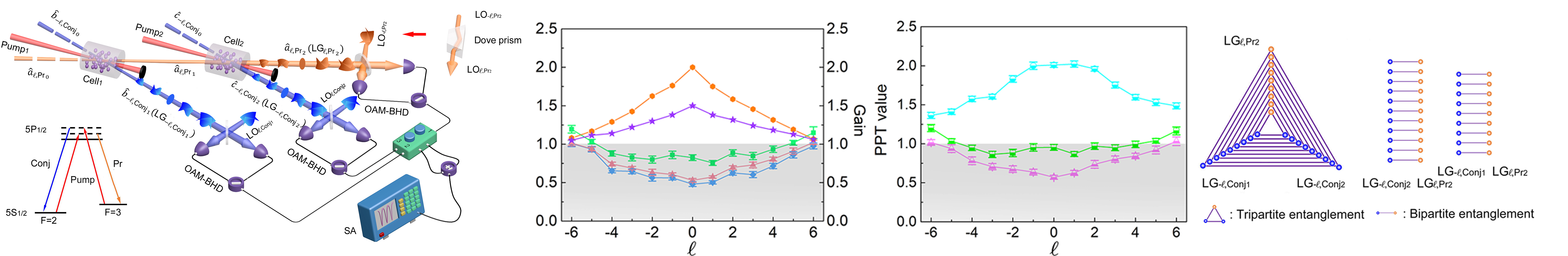 在实验中,该团队利用热原子系综中的级联四波混频过程产生了三光束的纠缠态。在这三束光通道中,系统同时确定性地产生了9组三光束纠缠的拉盖尔高斯(Laguerre-Gaussian,LG)模式和20组两光纠缠的LG模式。此外该工作还验证了系统中对三光束其中一束的拓扑荷数l进行符号变换后三束光不存在纠缠,从而证明了该级联四波混频过程中,非线性相互作用遵守光学轨道角动量守恒定律。该工作还研究了四波混频系统中三种不同类型的光学轨道角动量相干叠加模式情况下的三光束量子纠缠特性,多方面展示了系统丰富的纠缠结构。这项成果以“Deterministic Generation of Orbital-Angular-Momentum Multiplexed Tripartite Entanglement”为题,以完美网页版精密光谱科学与技术国家重点实验室为第一完成单位,博士研究生李思瑾与潘晓州为论文共同第一作者,荆杰泰教授为论文通讯作者,于2020年2月28日发表在《物理评论快报》(Physical Review Letters 124, 083605 (2020))上。