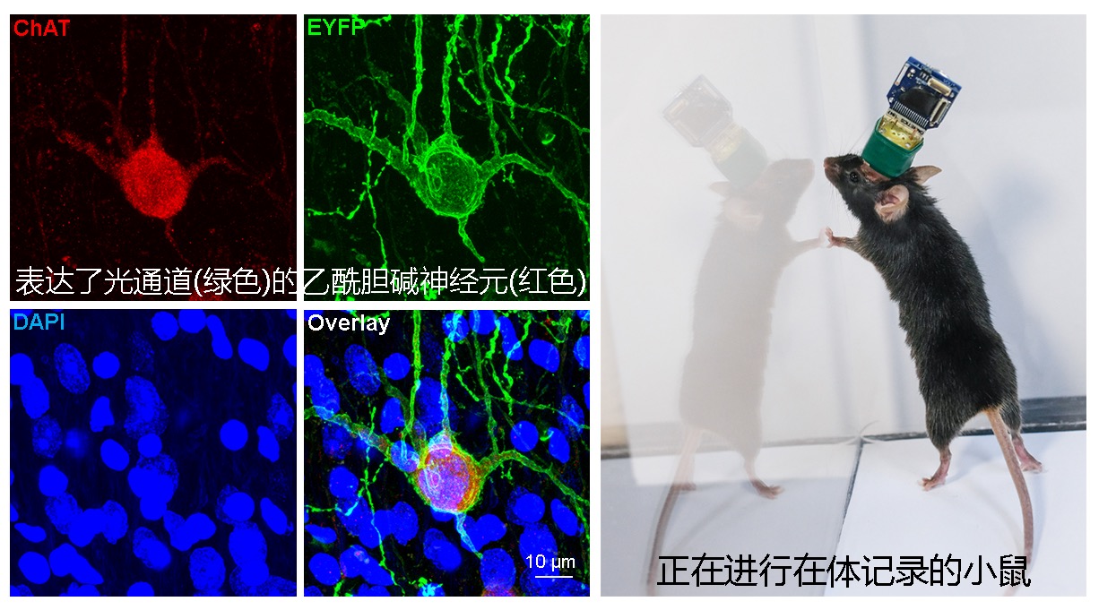 图2 光遗传学技术(左)和正在进行多通道在体记录的自由活动小鼠(右)