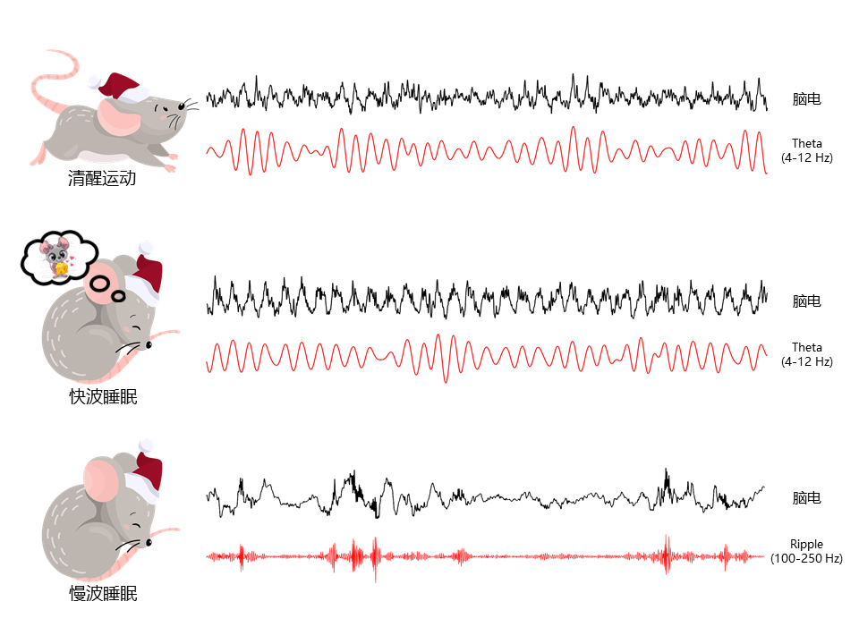 学习记忆是大脑最迷人的智能活动之一,在清醒时,大脑进行学习记忆活动,在休息时(主要是在夜晚的睡眠阶段),大脑对所学的内容加以记忆的巩固。根据睡眠时脑电的活动状况,可将睡眠分为慢波睡眠和快波睡眠(也称快速眼动睡眠)两个阶段。有趣的是,快波睡眠时的脑电活动和清醒时的非常相似(见下图),在大脑的海马脑区均以4-12赫兹的theta节律为主,此时如被唤醒,人们往往会报告正在做梦。因此,theta节律也被认为是在表征大脑学习记忆的“在线”编码过程。而在慢波睡眠阶段,海马脑电活动则表现为在慢波基础上叠加出现短暂的100-250赫兹的高频ripple节律,该高频节律被认为与记忆的巩固过程有关。