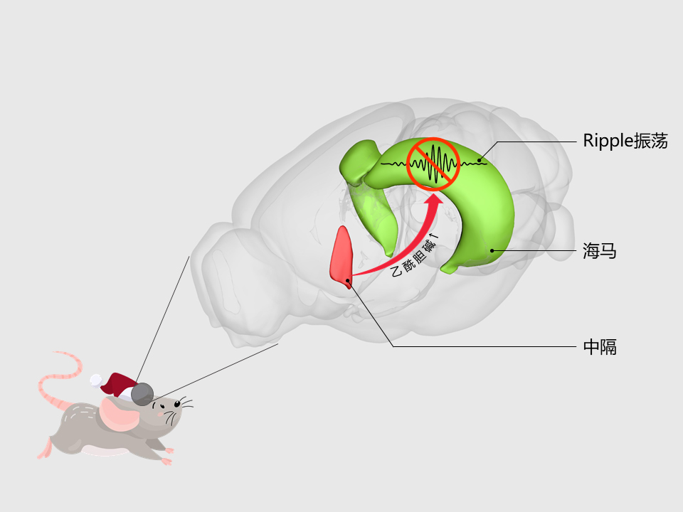 有意思的是,课题组进一步的实验揭示出这只是一种表面的高相关性。在非theta节律主导的慢波睡眠状态,运用光遗传学技术激活中隔乙酰胆碱神经元,并没有在海马脑区诱发出theta节律,反而是抑制了海马的高频ripple节律!课题组还进一步结合药理学方法,阐明了这种抑制作用是由乙酰胆碱的M2和M4型受体所介导。