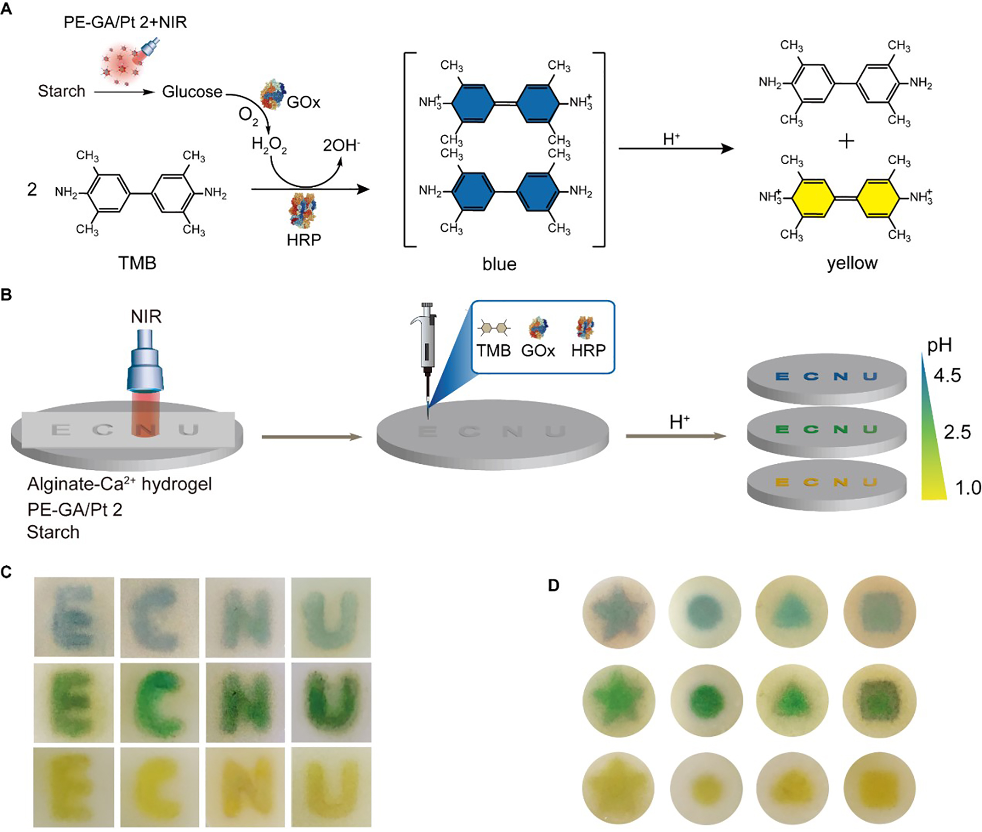 图3. 近红外光调控葡萄糖淀粉酶的活性实现水凝胶光照图案化。