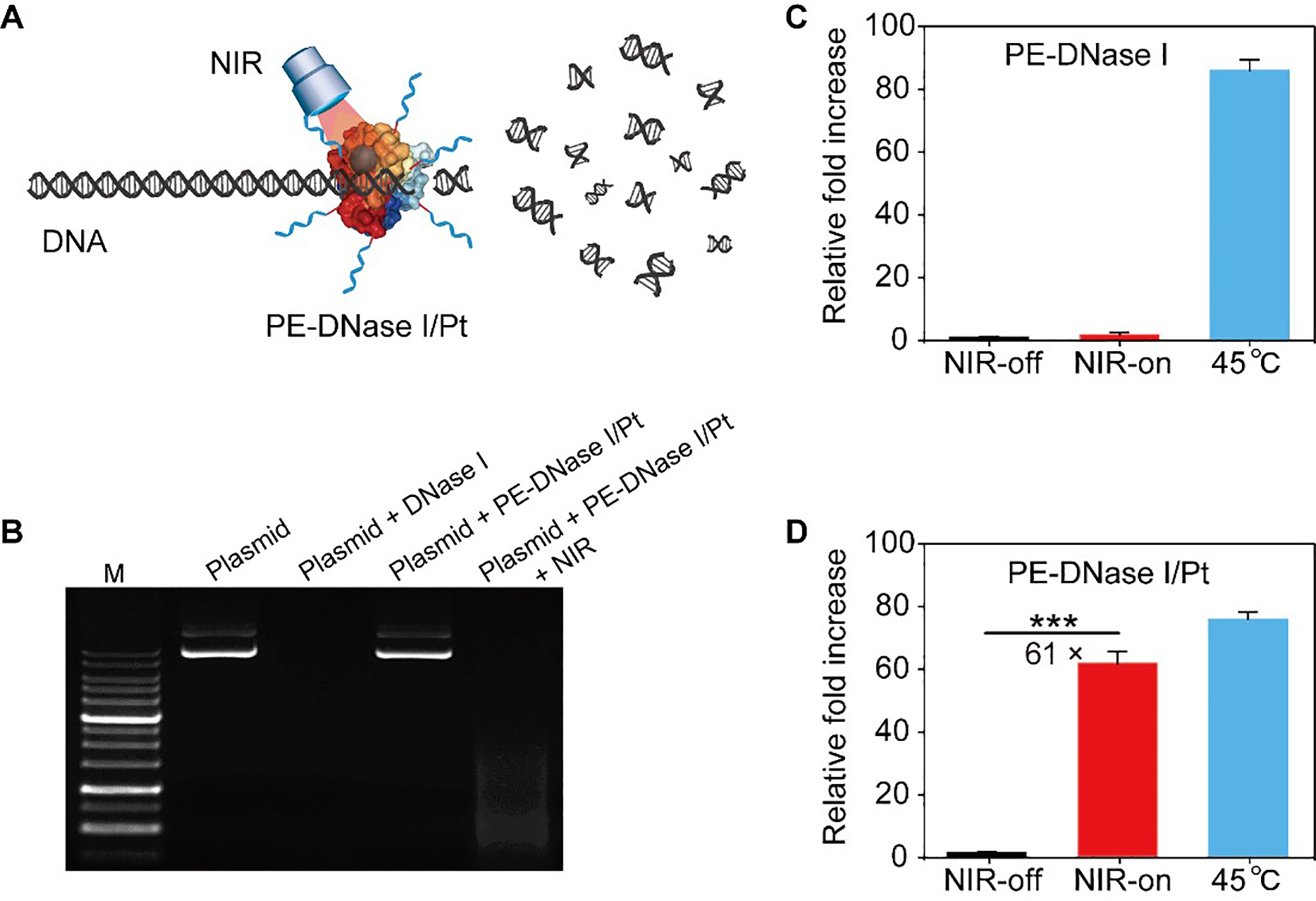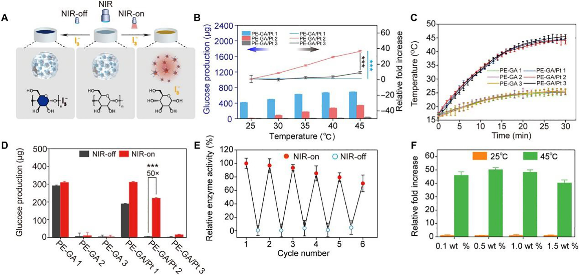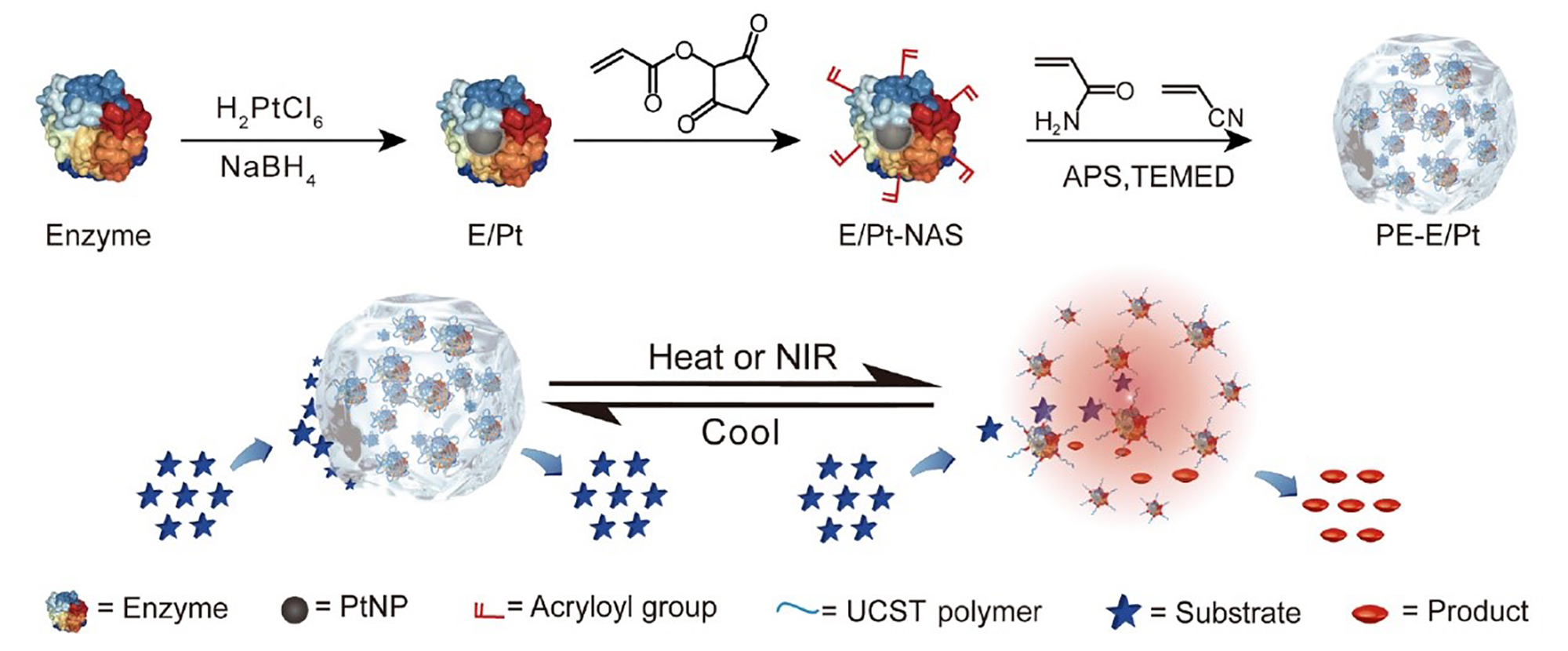 针对上述问题,程义云团队在酶的表面合成了具有温度敏感性的聚丙烯酰胺-丙烯晴共聚物,在酶的内部引入对近红外光响应的铂纳米颗粒(图1),实现了近红外光可逆地调控酶活的开启和关闭。聚丙烯酰胺-丙烯晴共聚物具有高临界相转变温度。当聚合物的局部温度低于其相转变温度时,表现为疏水特性,在水相体系中凝聚成微米尺度的颗粒,从而有效阻止了底物接触酶的催化中心,实现对酶活性的关闭;而当聚合物所处的环境温度高于其相转变温度时,表现为亲水特性,酶复合物进一步解聚成单分子形式,从而恢复酶的催化活性。利用酶内部的超小光热纳米材料的局部光热效应,可以动态调控酶所处的环境温度以及酶的生物活性。该团队成员以葡萄糖淀粉酶、蛋白酶、核酸酶为研究对象(图2-图4),在调控过程中实现了数十倍的酶活调节。该研究为近红外光可逆、开关式调控酶的生物活性提供了新的方法和思路。