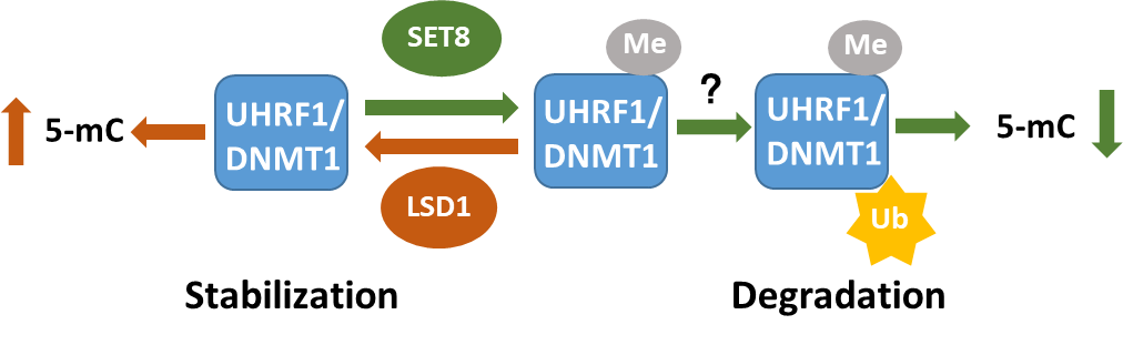 SET8与LSD1动态调控DNMT1/UHRF1甲基化依赖的泛素降解从而影响DNA甲基化的调控机制模型