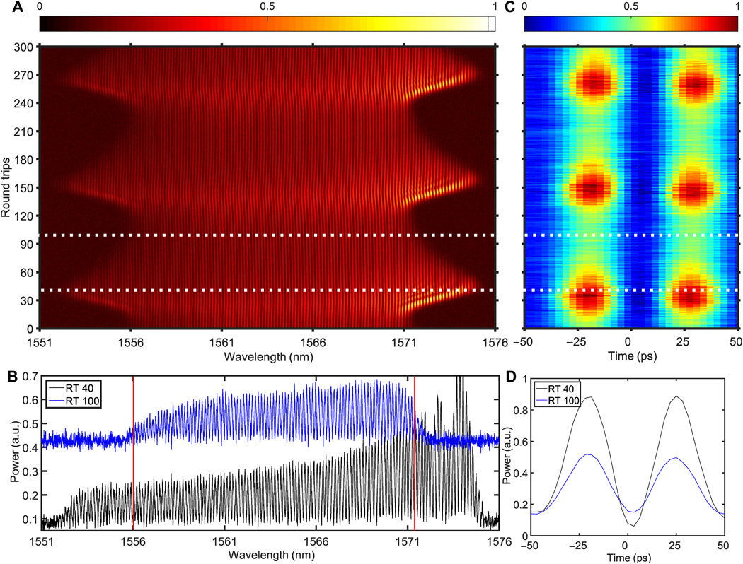 图2:呼吸子分子动力学。如A所示,这里的光谱由一根根精细的线条构成,这表明时域上有两个脉冲正如图C所示。此外光谱随着距离(纵坐标)周期性地变宽变窄,表明这是呼吸子分子。图C从时域上更直观地展现呼吸子分子的周期性变化。