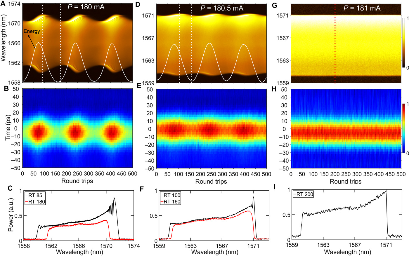 图1:呼吸子高速演化动力学。A,B分别是呼吸子的光谱和时域的周期性演化。横坐标是距离。随着距离的增加可以看出呼吸子的光谱和时域均出现周期性变化。当增强非线性时,呼吸子的这种周期性变化会变弱(D,E),进一步增强非线性时,孤子会出现。G,H是孤子的光谱和时域,由图可以看出这两个参量在传输过程中均保持不变。