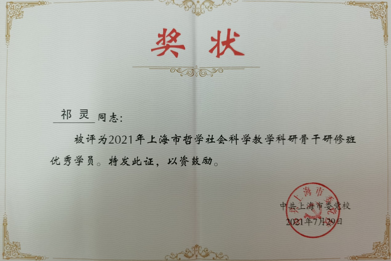 体育与健康学院专职辅导员祁灵获评2021年上海市哲社骨干研修班优秀学员