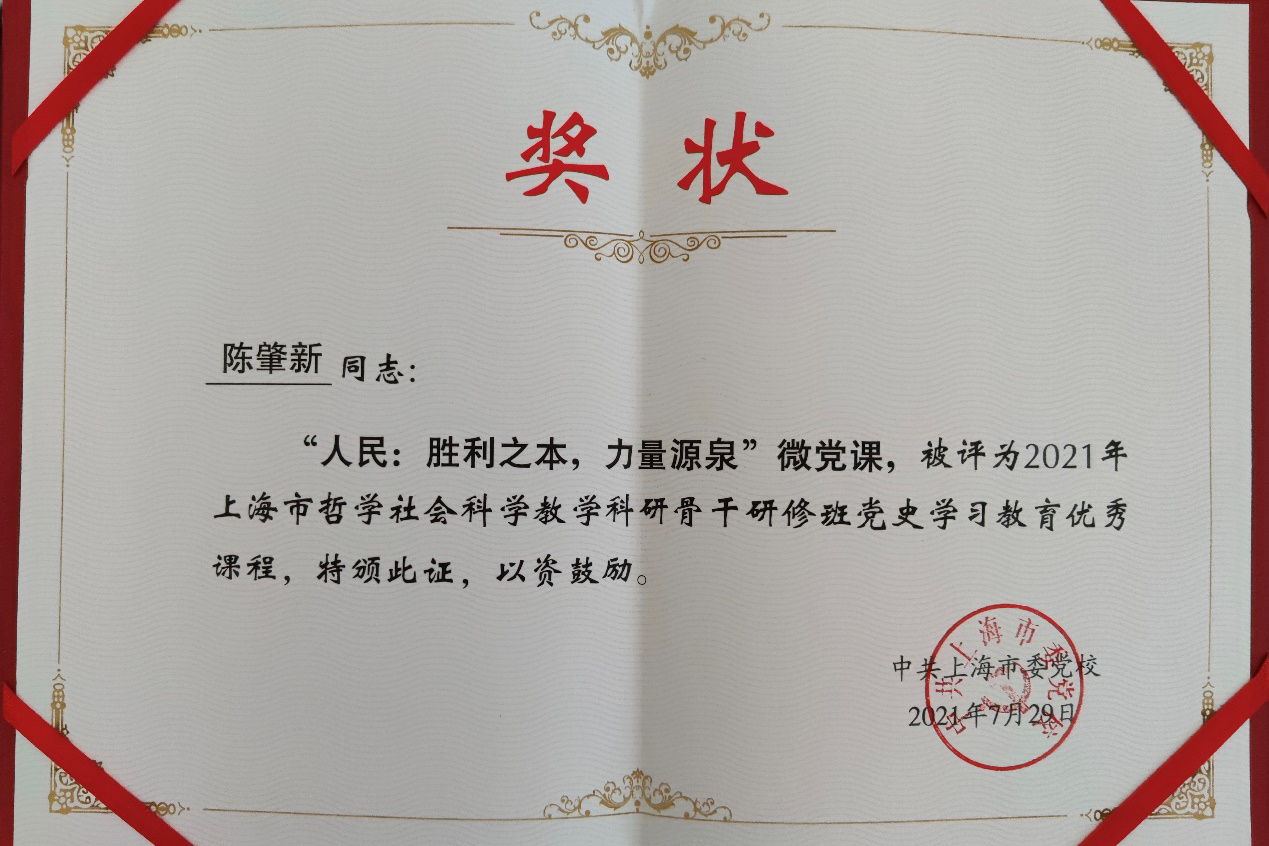 获评2021年上海市哲社骨干研修班党史学习教育优秀课程