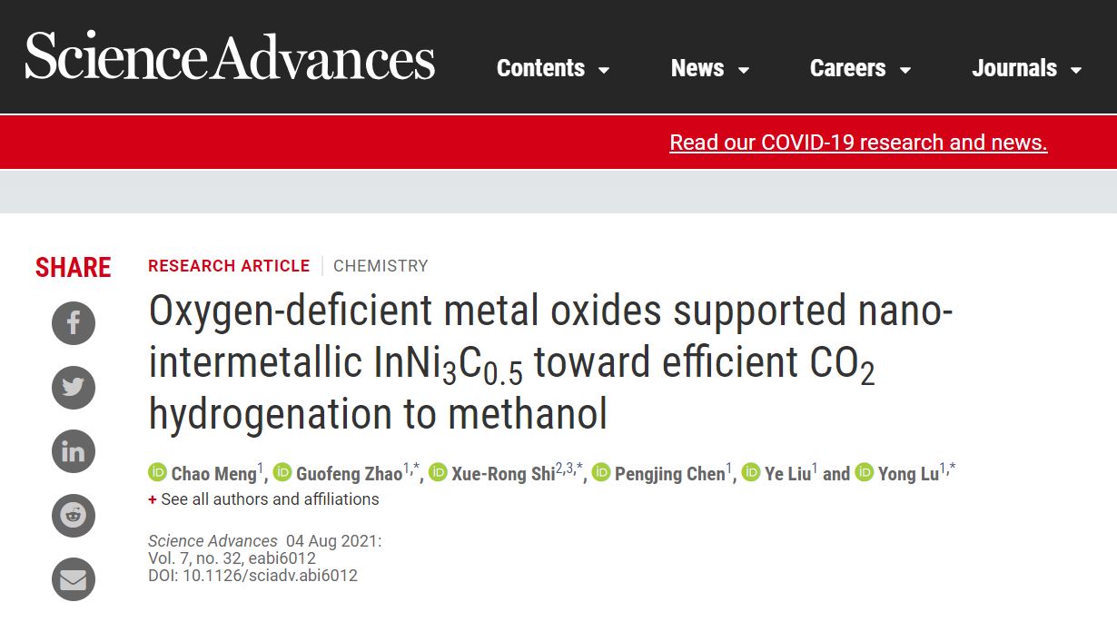 完美网页版化学与分子工程学院、上海市绿色化学与化工过程绿色化重点实验室路勇教授课题组在二氧化碳加氢高效合成甲醇的研究中取得重要进展,相关成果《富氧缺陷金属氧化物负载纳米金属间化合物InNi3C0.5用于二氧化碳加氢高效合成甲醇》(Oxygen-deficient metal oxides supported nano-intermetallic InNi3C0.5 towards efficient CO2 hydrogenation to methanol)发表于Science出版集团子刊《Science Advances》上(2021, 7(32), eabi6012)。博士生蒙超为论文第一作者,完美网页版路勇教授、赵国锋副研究员和上海工程技术大学史雪荣副教授为论文共同通讯作者,完美网页版为第一完成单位。