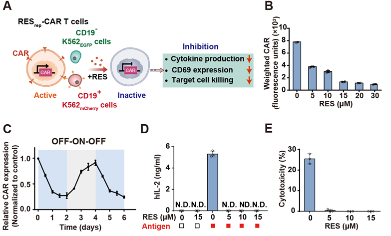 首先,研究人员设计通过白藜芦醇抑制转基因表达系统调控CAR受体的表达(RESrep-CAR),使白藜芦醇调控的抑制型CAR-T细胞在白藜芦醇不存在的情况下可以持续性表达CAR并杀伤肿瘤细胞,而当加入白藜芦醇时,则抑制CAR受体的表达,关闭CAR-T细胞的功能。通过优化,研究人员在T细胞中实现了可逆调控CAR的表达、细胞因子释放及肿瘤细胞杀伤(见图3)。