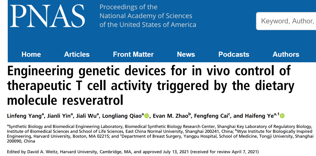 8月18日,叶海峰团队在《美国科学院院刊》PNAS上发表了题为Engineering genetic devices for in vivo control of therapeutic T cell activity triggered by the dietary molecule resveratrol的研究论文,经过六年半科研攻关,他们成功开发出了一种红酒成分白藜芦醇调控转基因表达的控制系统,并利用该系统调控T细胞以提高肿瘤免疫治疗的安全性。