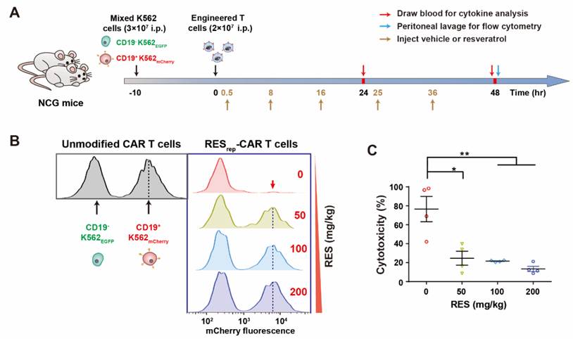 将工程化RESrep-CAR T细胞移植至人白血病小鼠模型(免疫缺陷型鼠NCG)体内,可通过调节白藜芦醇给药剂量来可控抑制细胞因子释放及肿瘤杀伤(见图4)。
