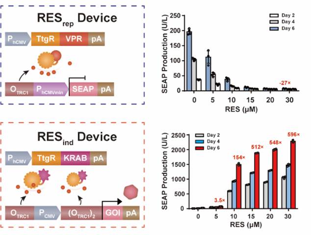 研究人员首先将来自于一种恶臭假单胞菌(Pseudomonas putida)中响应白藜芦醇的转录阻遏蛋白TtgR、TtgR特异识别的操纵子DNA序列OTtgR和转录抑制子(KRAB)/激活子(VPR)等生物功能元器件进行理性设计、组装和重编程,分别构建了白藜芦醇调控转基因表达的抑制系统(RESrep device)和诱导系统(RESind device)(见图2)。通过元件优化,最终分别获得了灵敏度高、诱导倍数高的基因表达抑制系统和诱导系统,并在哺乳动物细胞及小鼠体内均证实了优异的基因表达调控效果。