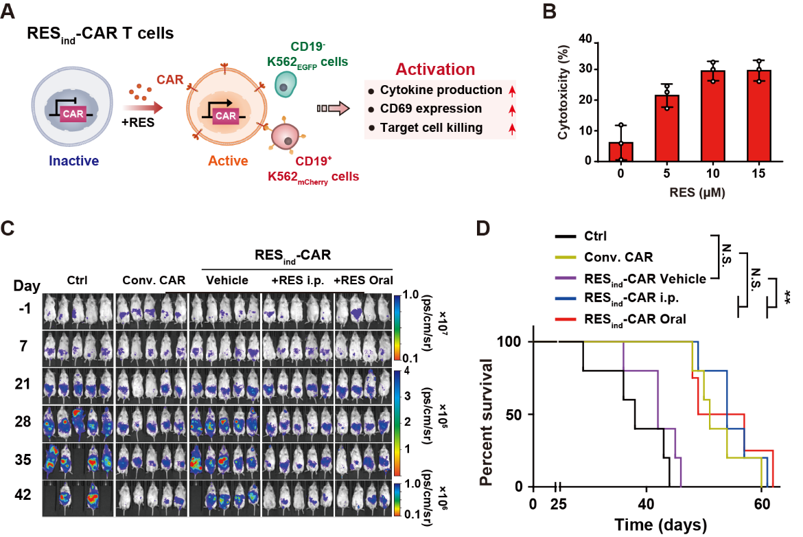 接下来,团队通过白藜芦醇诱导基因表达系统调控CAR受体的表达(RESind-CAR),实现了通过白藜芦醇剂量调控CAR受体表达及CAR依赖的T细胞功能激活。体外及体内白血病肿瘤模型鼠的实验结果也展示了RESind-CAR对CAR-T细胞激活的优异调控效果。在白血病小鼠模型中,通过口服或者腹腔注射白藜芦醇都可以精准调控RESind-CAR T细胞对肿瘤细胞的杀伤,从而延长了小鼠的生存时间(见图5)。