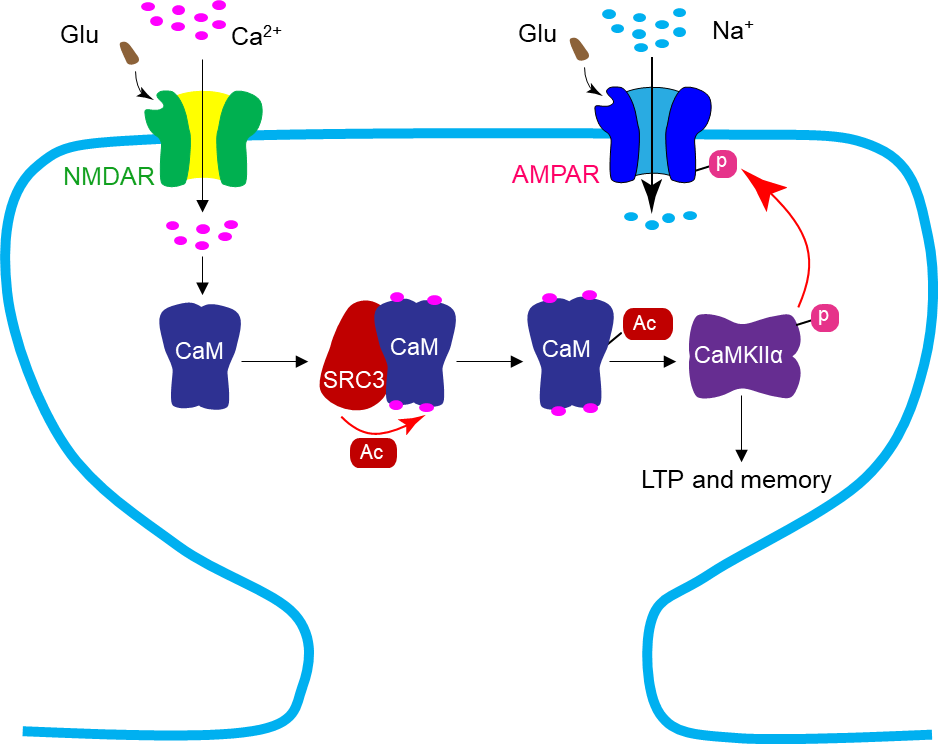 神经活动激活NMDA受体,Ca2+内流引起SRC3乙酰化CaM,Ac-CaM更强地激活CaMKIIα,从而调控海马突触可塑性(long-term potentiation, LTP)和学习记忆。