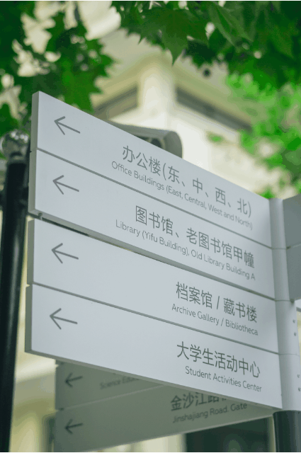 这一角度还被运用在整个标识系统的各个方面,比如在标识牌上呈现的首任校长孟宪承提出的“智慧的创获、品性的陶熔、民族和社会的发展”之大学理想——“3C”理念。