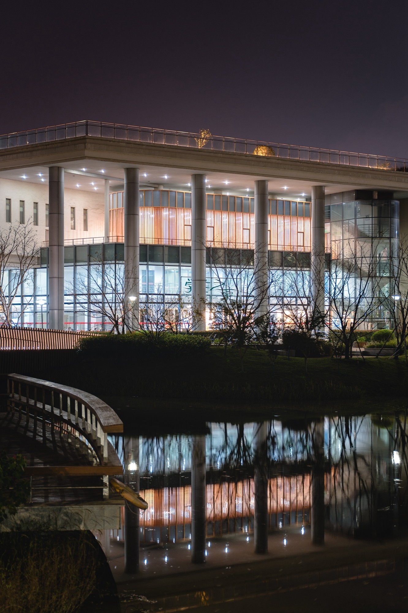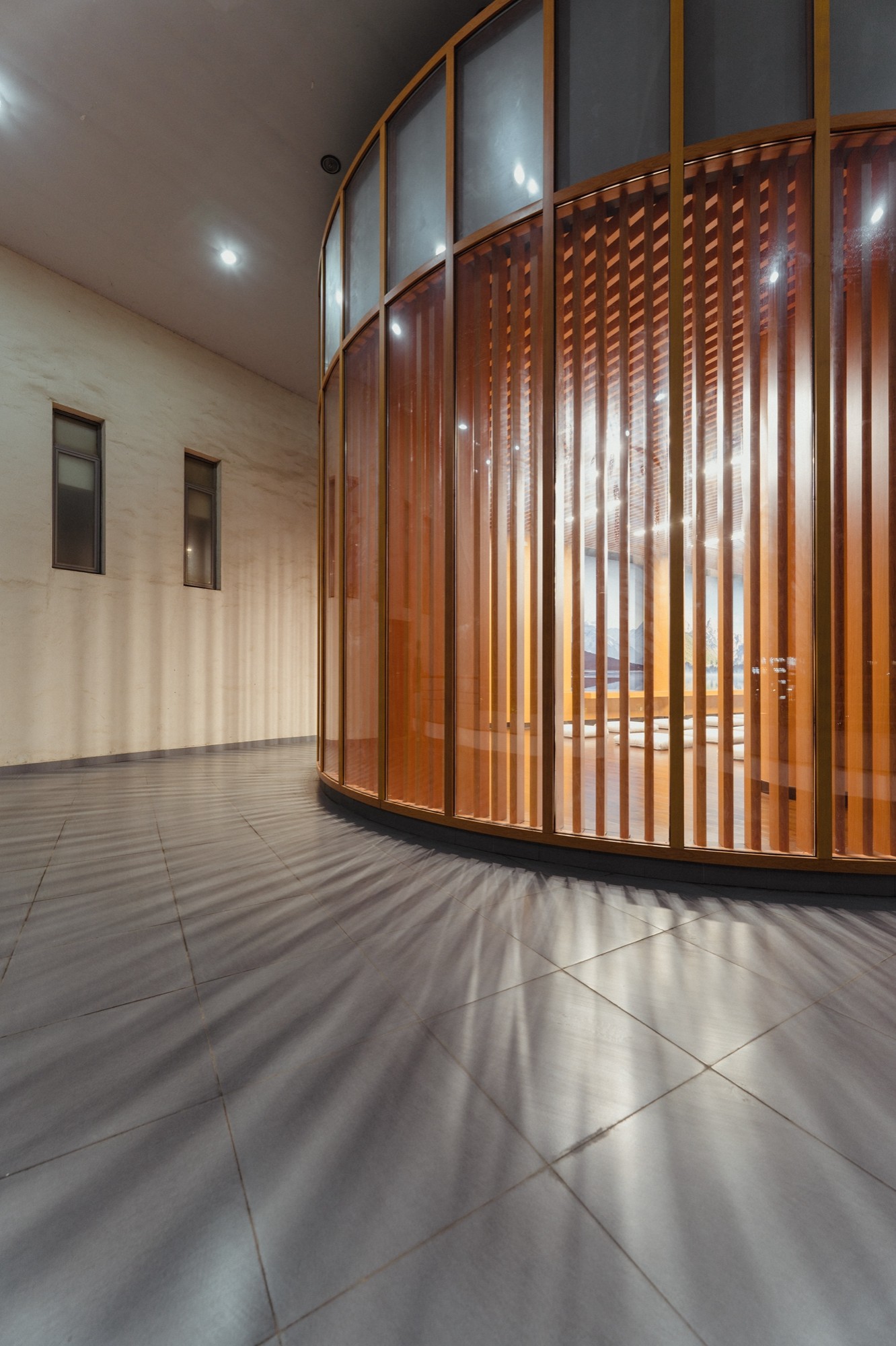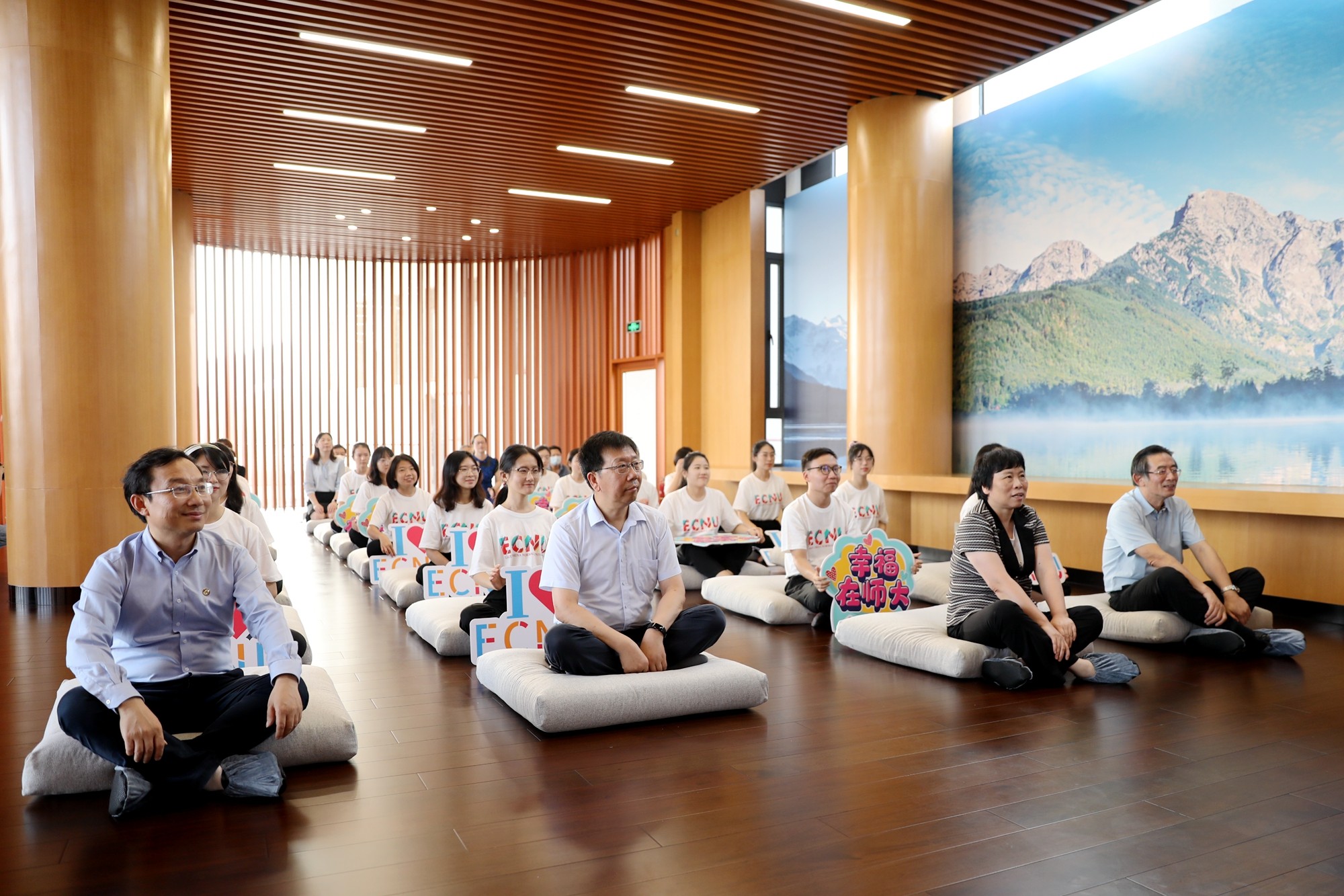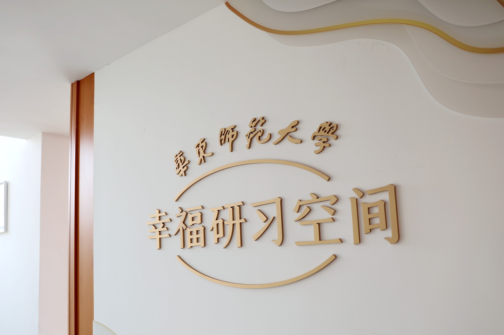 置身幸福研习空间,有种特别的空灵与清雅。约160多平方米的面积并不大,预计可容纳30-40人,却为师生在忙碌的生活中开辟了一方整理思绪、疗愈心灵的小天地。当阳光穿过木纹铝格栅洒在地面,形成光影的韵律感。墙面喷涂的海阔天空图案被柔和的光包裹着,远离喧嚣、舒缓身心、缓解压力、涤荡思维。