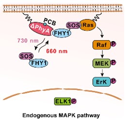 利用光来控制细胞信号通路可以为基础研究提供便捷可控的研究方法。因此,叶海峰课题组将ΔPhyA定位到细胞膜上,将FHY1和SOS蛋白的激活域SOScat进行融合表达,通过红光照射来控制SOScat的细胞定位,从而实现了Ras/MAPK信号通路的激活和去激活,成功构建了REDMAPSOS-Ras工具。此外,研究人员还构建了REDMAPCas工具,将REDMAP系统与基因编辑工具CRISPR-dCas9结合在一起,实现了对哺乳动物细胞、小鼠肝脏及肌肉内源基因转录的高效调控。