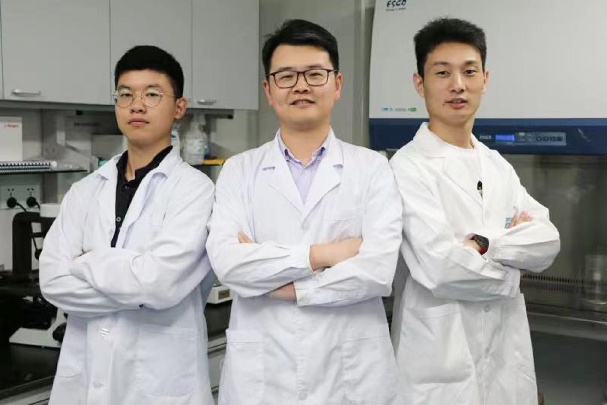 叶海峰(中)与论文共同第一作者周阳(左)、孔德强(右)
