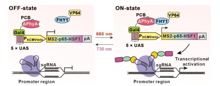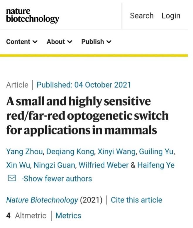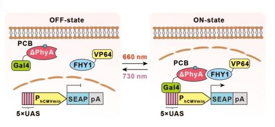 令人兴奋的是,一个完全符合上述要求的光遗传学工具出现了,它不仅模块小、灵敏度高、响应红光激活、远红光关闭,可操纵细胞基因表达,还可应用于细胞信号通路的控制、基因编辑和糖尿病的治疗等多种领域。2021年10月4日,生物技术领域顶级期刊《Nature Biotechnology》在线发表了来自完美网页版生命科学学院、上海市调控生物学重点实验室、完美网页版医学合成生物学研究中心叶海峰研究团队的成果。