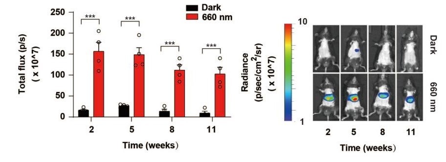 研究人员还探究了REDMAP系统在基因治疗领域的能力。由于截短的ΔPhyA蛋白具有较小的尺寸,可以利用腺相关病毒包装。因此,研究人员将REDMAP包装至腺相关病毒(AAV2/8)中并将其注射至小鼠体内,实现了长达三个月以上的光控基因表达。