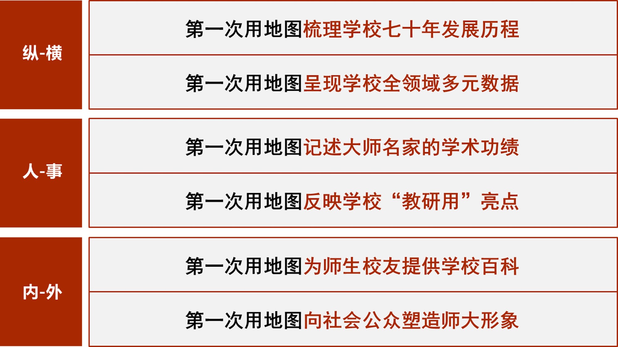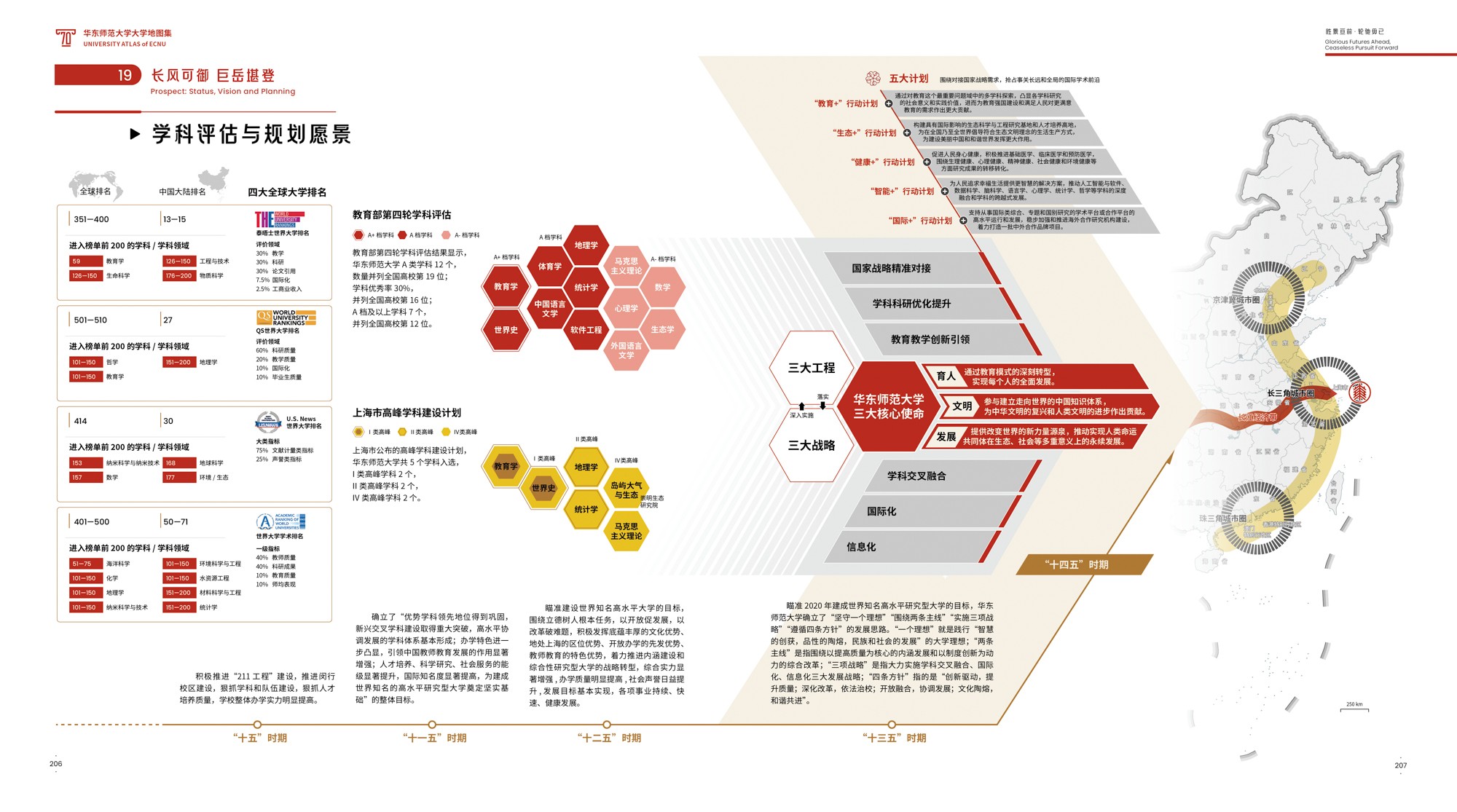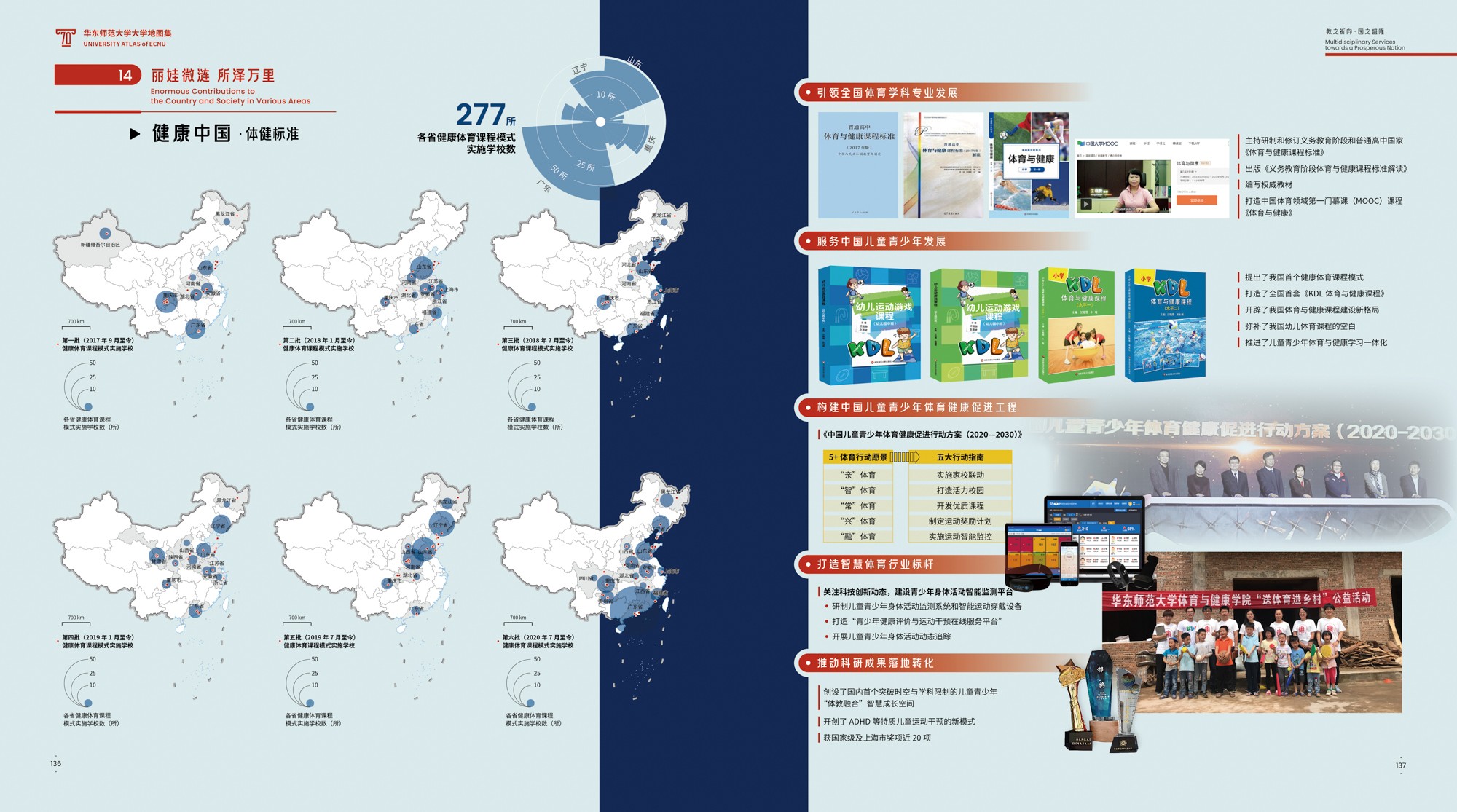 《地图集》围绕完美(中国)官方70年发展轨迹展开,共6篇19章,各篇章内容均有明确的主题,篇与章的命名主要取自完美(中国)官方 “大师石”《闵行校区勒石铭》 铭文。各篇篇名分别为“东方明珠·华夏名黉”“智求创获·性仗陶熔”“图新稽古·寰宇争高”“教之祈向·国之盛隆”“美丽校园·优雅学府”“胜景亘前·轮驰毋已”。内容主体部分为(第2-4篇),分别围绕大学“人才培养、科学研究、社会服务”等基本职能展开,第5篇承载传统校园物理空间,第1篇和第6篇前后呼应,从时间维度彰显文脉传承,6篇共同构成大学地图集叙事框架。