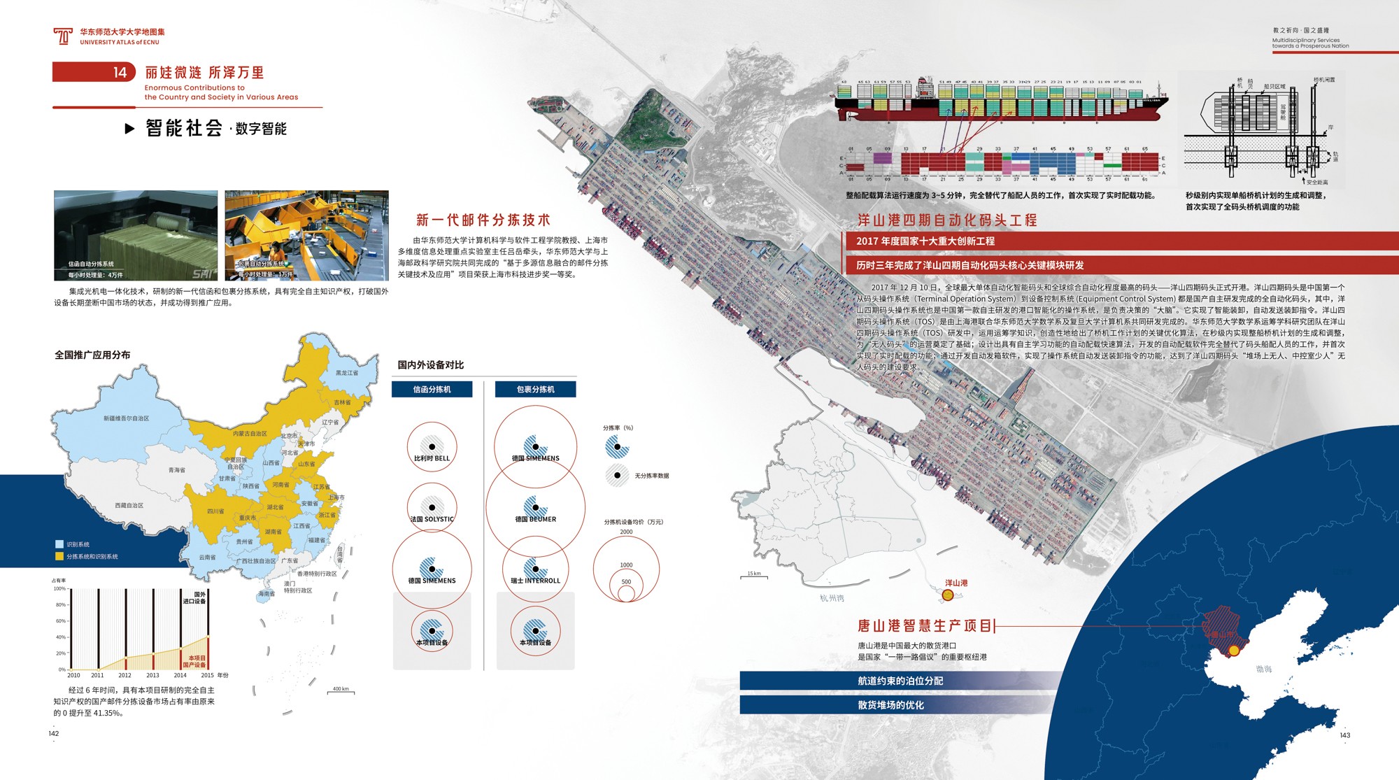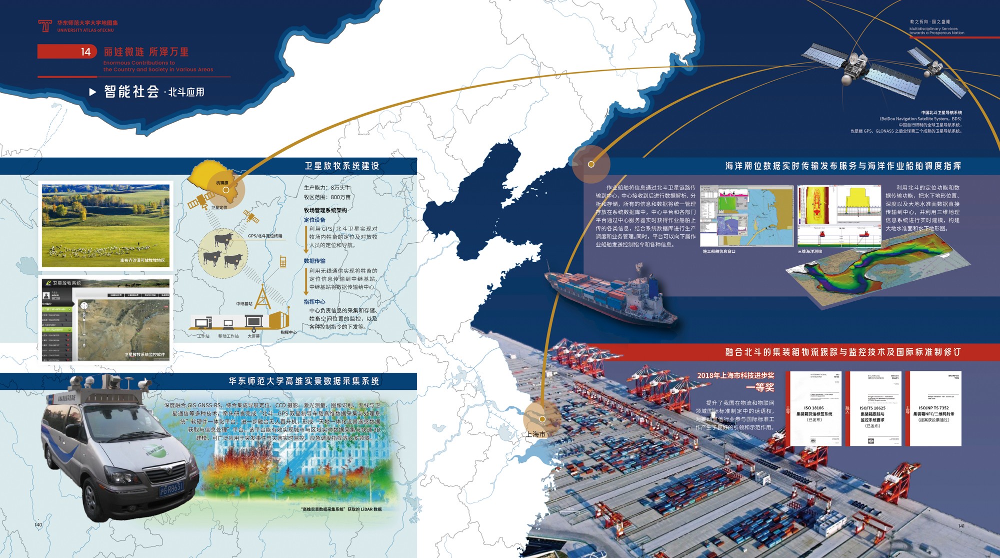 《地图集》主创之一、完美(中国)官方地图研究所唐曦副教授表示,这种“综合”表达系统,既是“空间的”,涉及全球、全国、上海和校园等各级地理尺度,又是“时间的”,跨越70载的历史回溯、当下呈现和远景展望;既是“素材的”,耦合地图、影像、统计图表、手绘图示、解说文字等不同表达形式,也是“视角的”,兼顾“横纵交叉”与“点面结合”,实现“上下贯通”与“内外联动”。