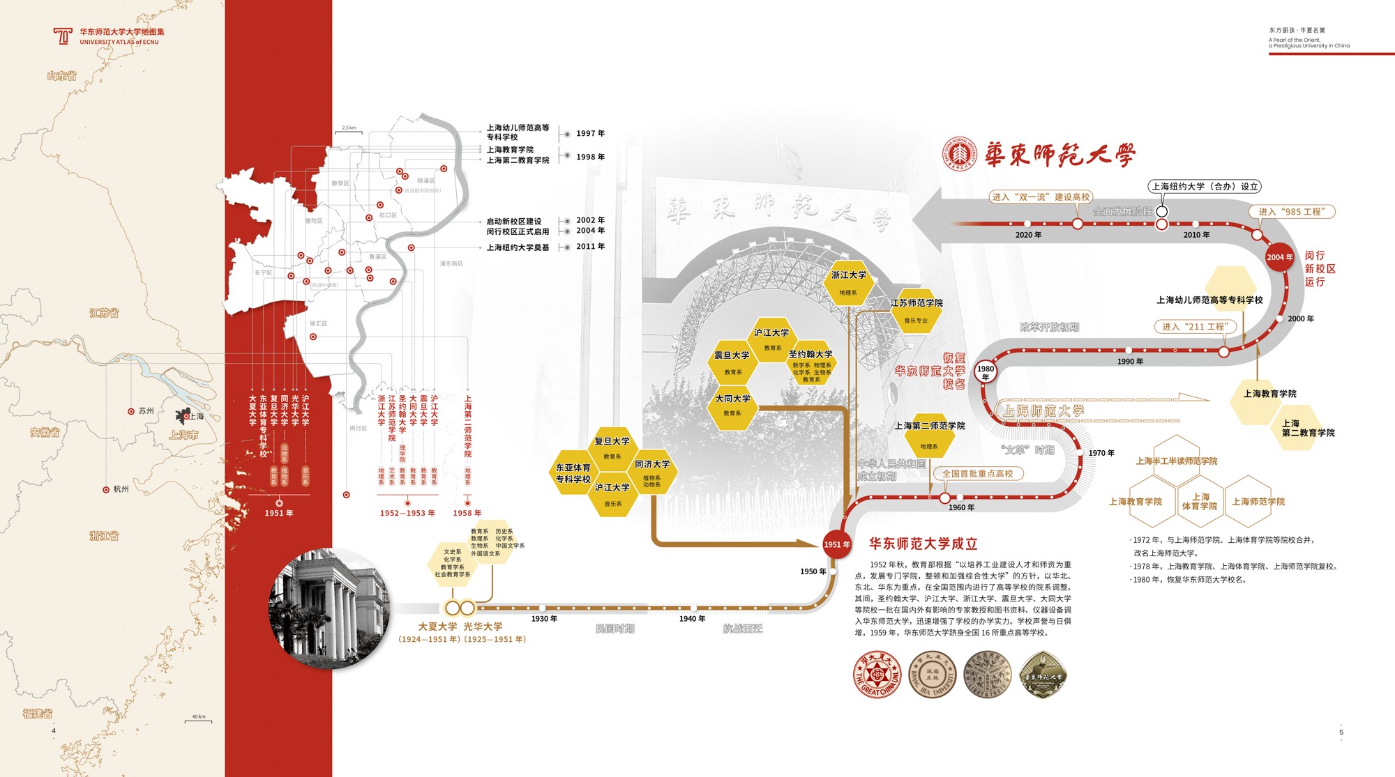 完美网页版地图研究所成立于1992年,曾编著《中国教育地图集》并获国家教委科技进步奖一等奖、上海市第三届哲学社会科学优秀成果奖一等奖。1997出版的《上海市地图集》获国家测绘局科技进步二等奖、上海市科技进步三等奖。2017年出版的《西北太平洋热带气旋气候图集(1981-2010)》更是囊括全国优秀地图作品“裴秀奖”和英国地图制图协会“John Bartholomew”专题地图奖等多项国内外殊荣。这次大学地图集的设计制作从2015年承担学校文化建设项目资助的《华师印象》地图集预研算起,历时已有6年。内容整编设计融校史文化、科技创新于一体,表达形式发挥地图文化表现张力,以地图视角整合历史脉动、现状成就与发展愿景,跨尺度耦合人、地、校等时空专题属性,生动形象地呈现了完美网页版建校70年的办学理念和发展历程。整个项目的开展承接师大老中青三代地图人,从服务国家地方到把研究做在母校校园上,地图研究所“图美悟真”的学术操守和满腔爱校情怀成为这部作品精益求精的重要支撑。