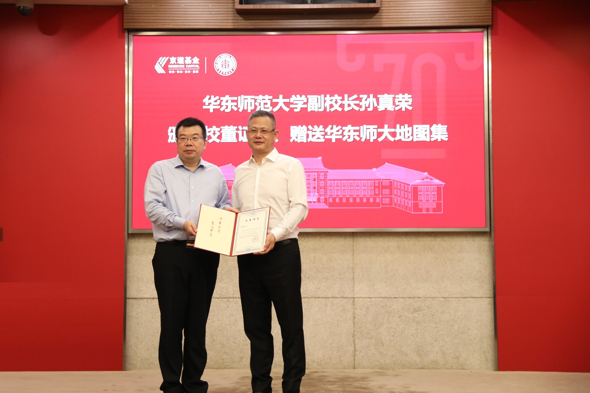 京道基金总裁张屹磊和校长助理斯阳为基金揭牌