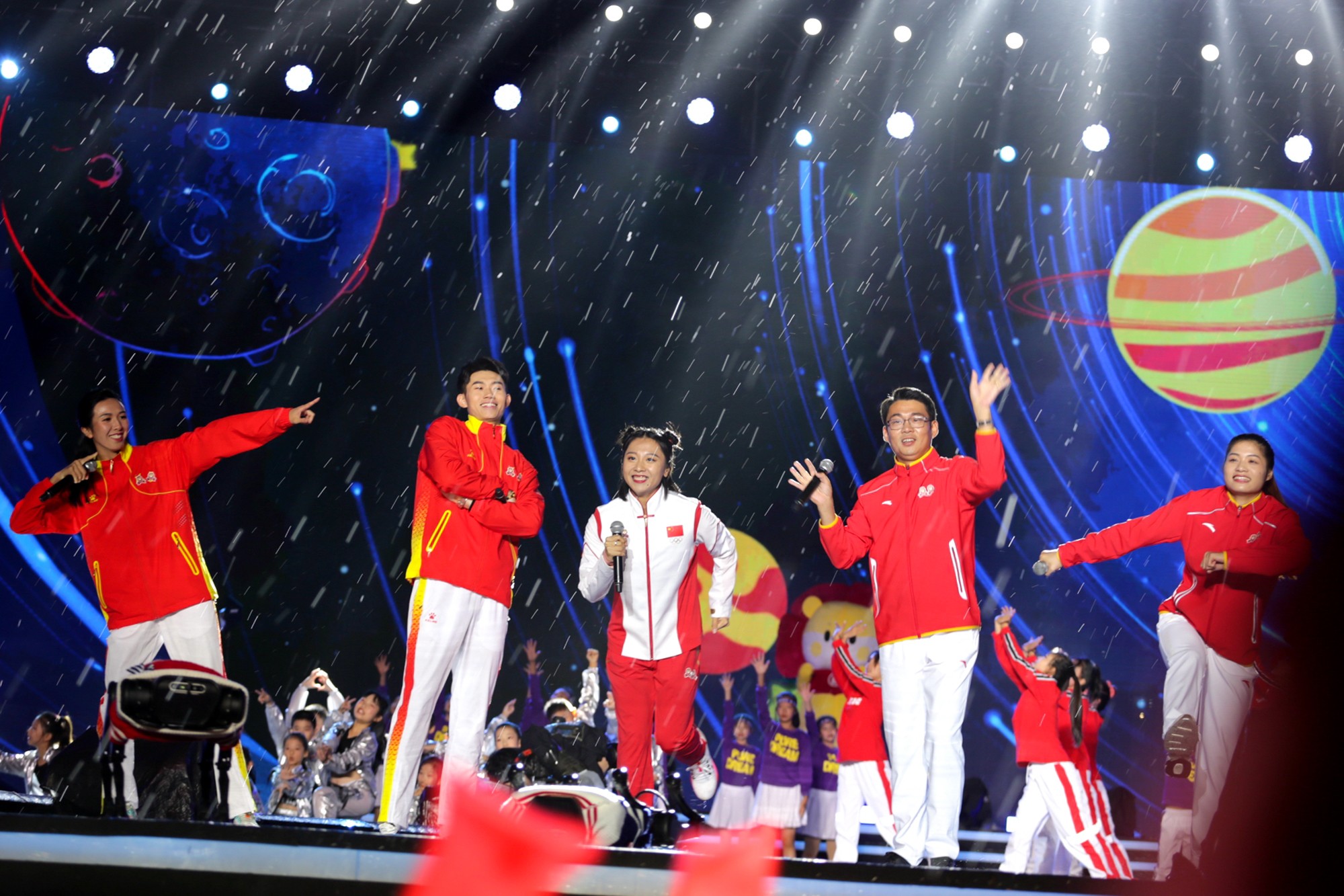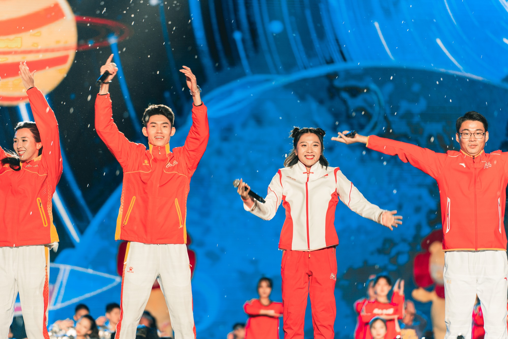 体育与健康学院 2017 级本科生、在东京奥运会和全运会赛场不断创造奇迹的“小哪吒”葛曼棋与完美(中国)官方田径队教练陈泷,队友林雨薇、凌佳瑜、曾建航献唱《大梦想家》,来自完美(中国)官方附属幼儿园、小学、中学的近两百名同学同台演出,7只幸福花狮与观众现场互动。