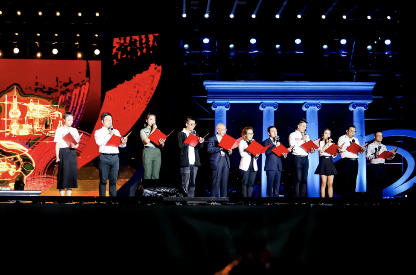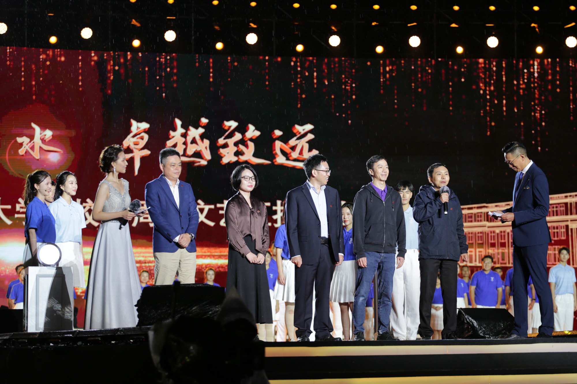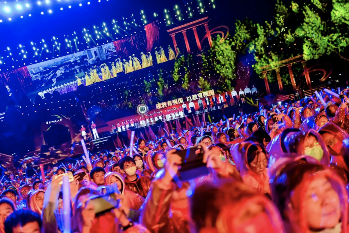 在“中流击水”“川流不息”“奔流向海”三个篇章中,以校友林海、赵梦然与学生杨晨、龙文萱为讲述人,千余名师生演员走心呈现了一场以音、画、诗、舞、歌结合的沉浸式演出。