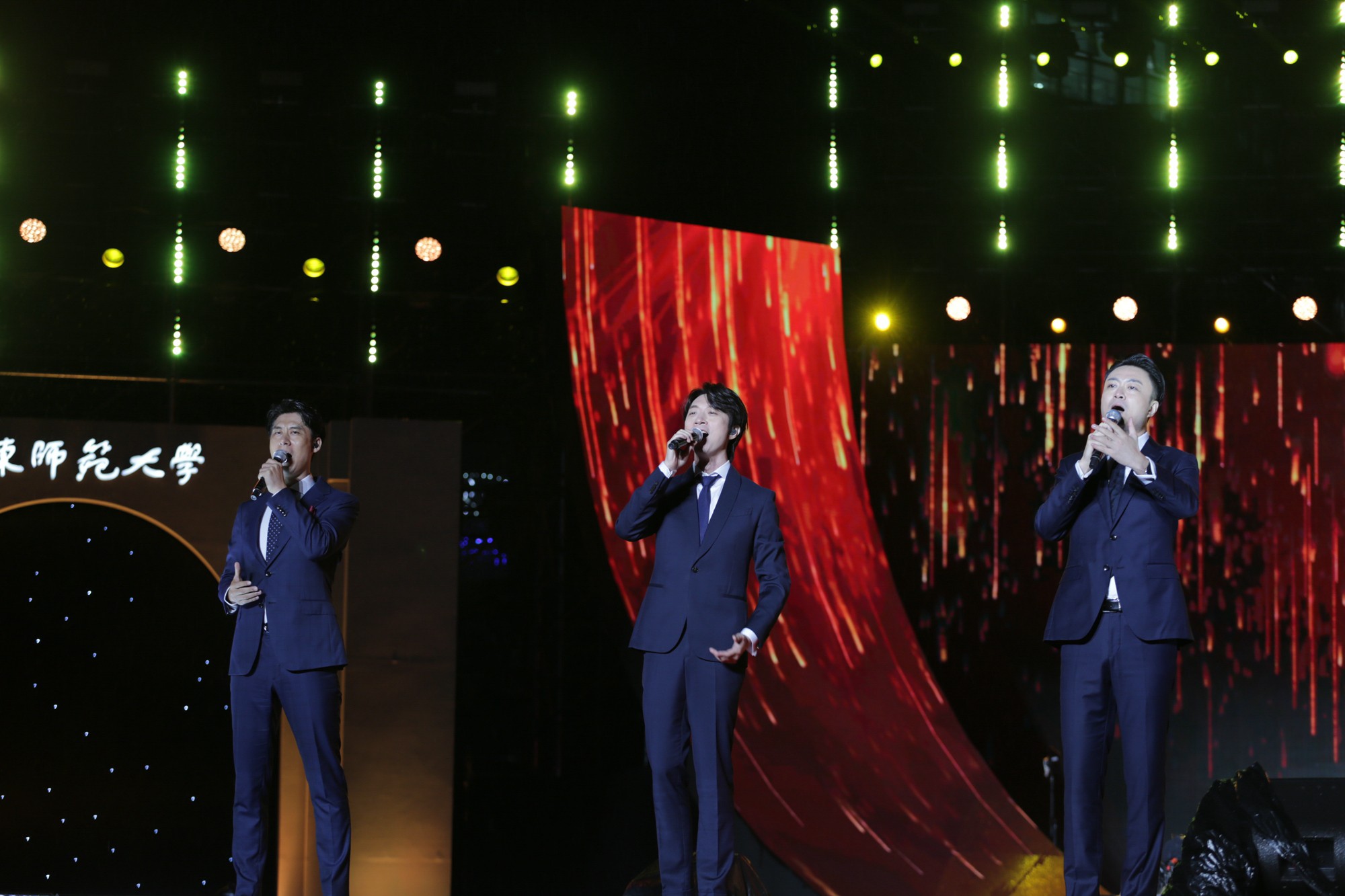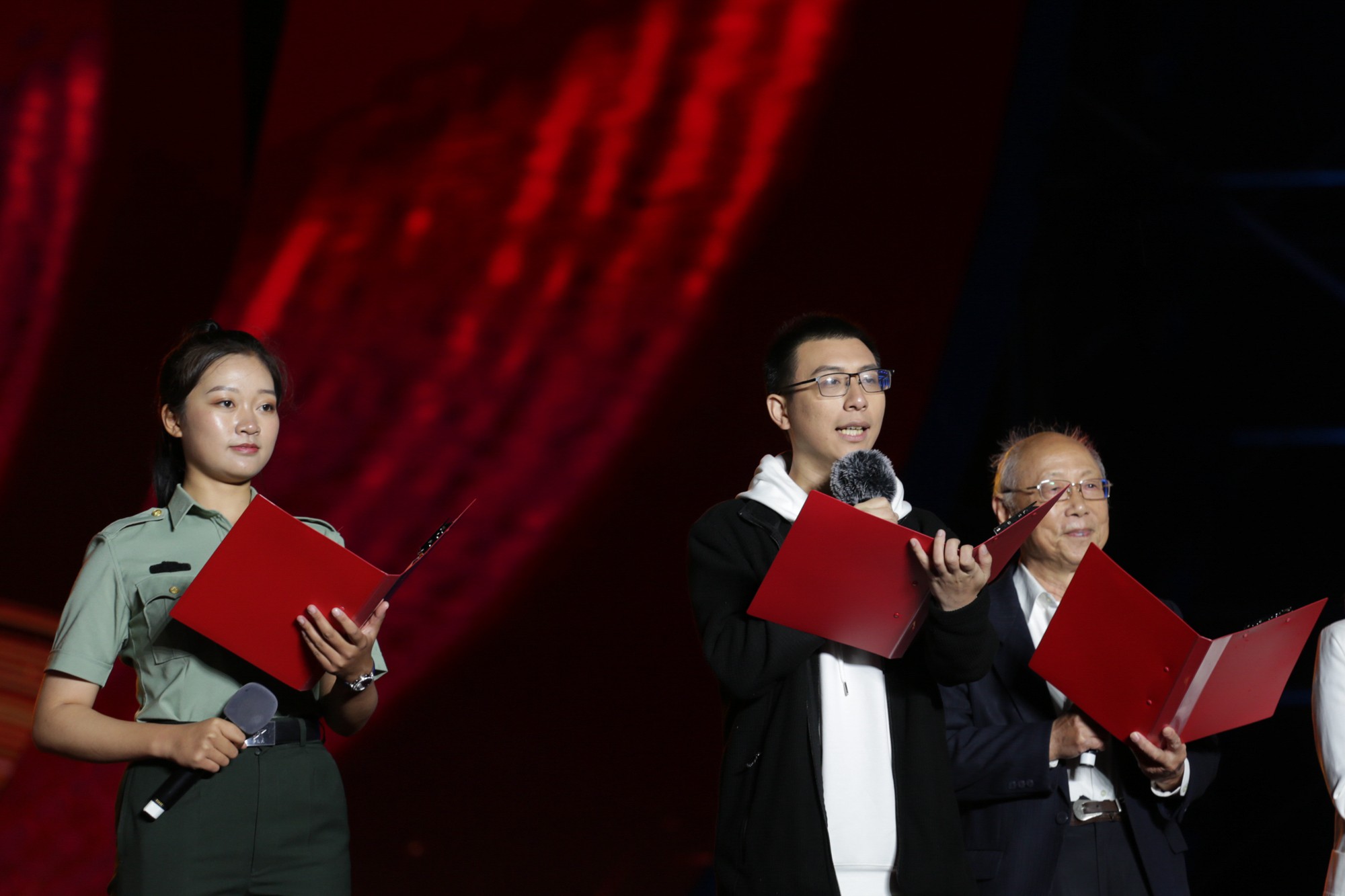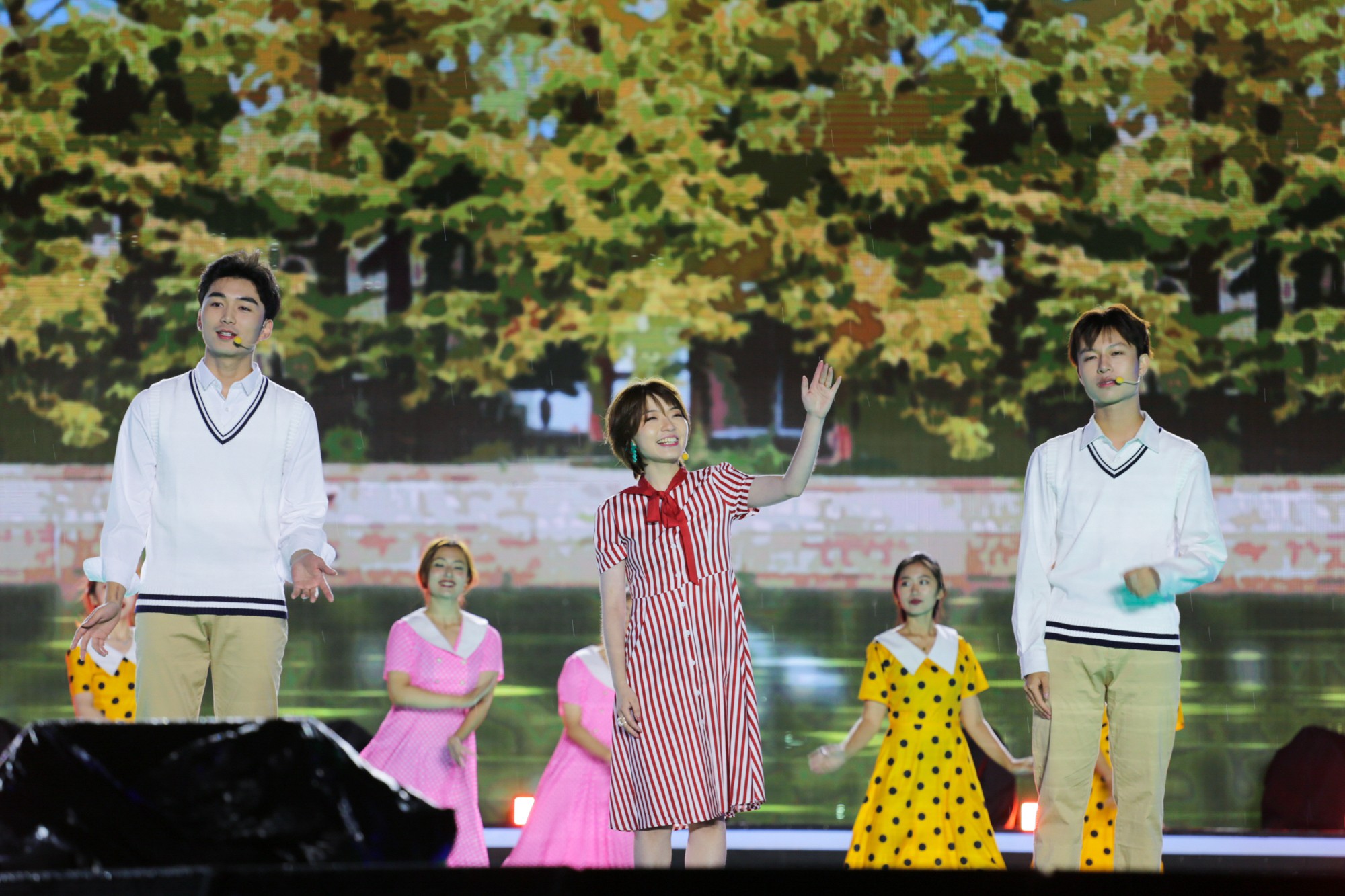 在“中流击水”“川流不息”“奔流向海”三个篇章中,以校友林海、赵梦然与学生杨晨、龙文萱为讲述人,千余名师生演员走心呈现了一场以音、画、诗、舞、歌结合的沉浸式演出。