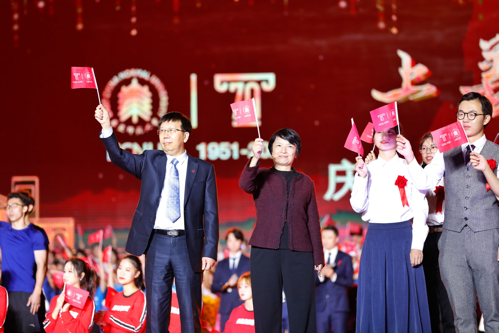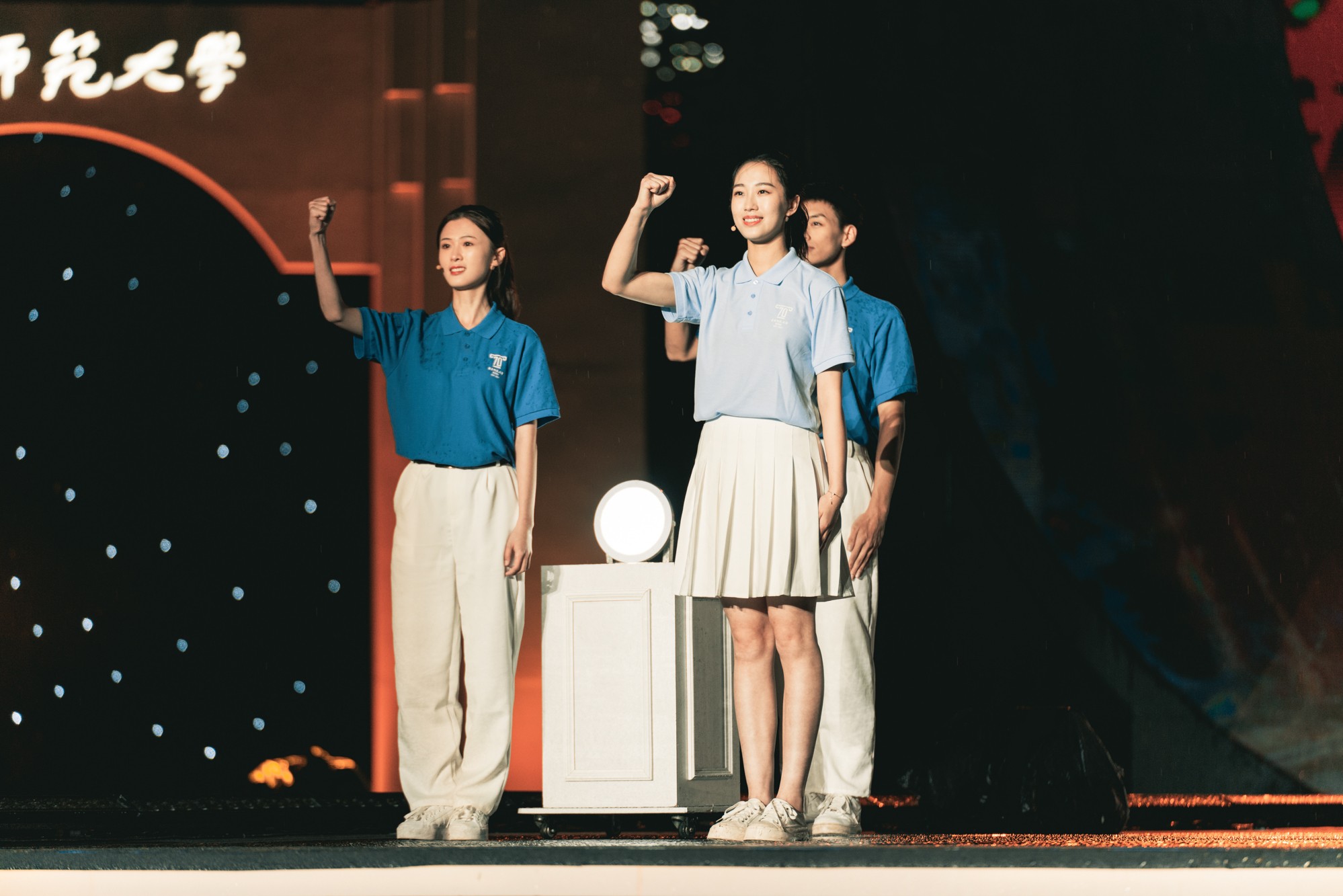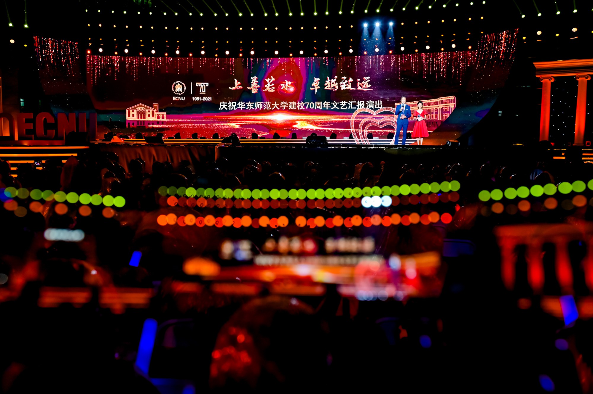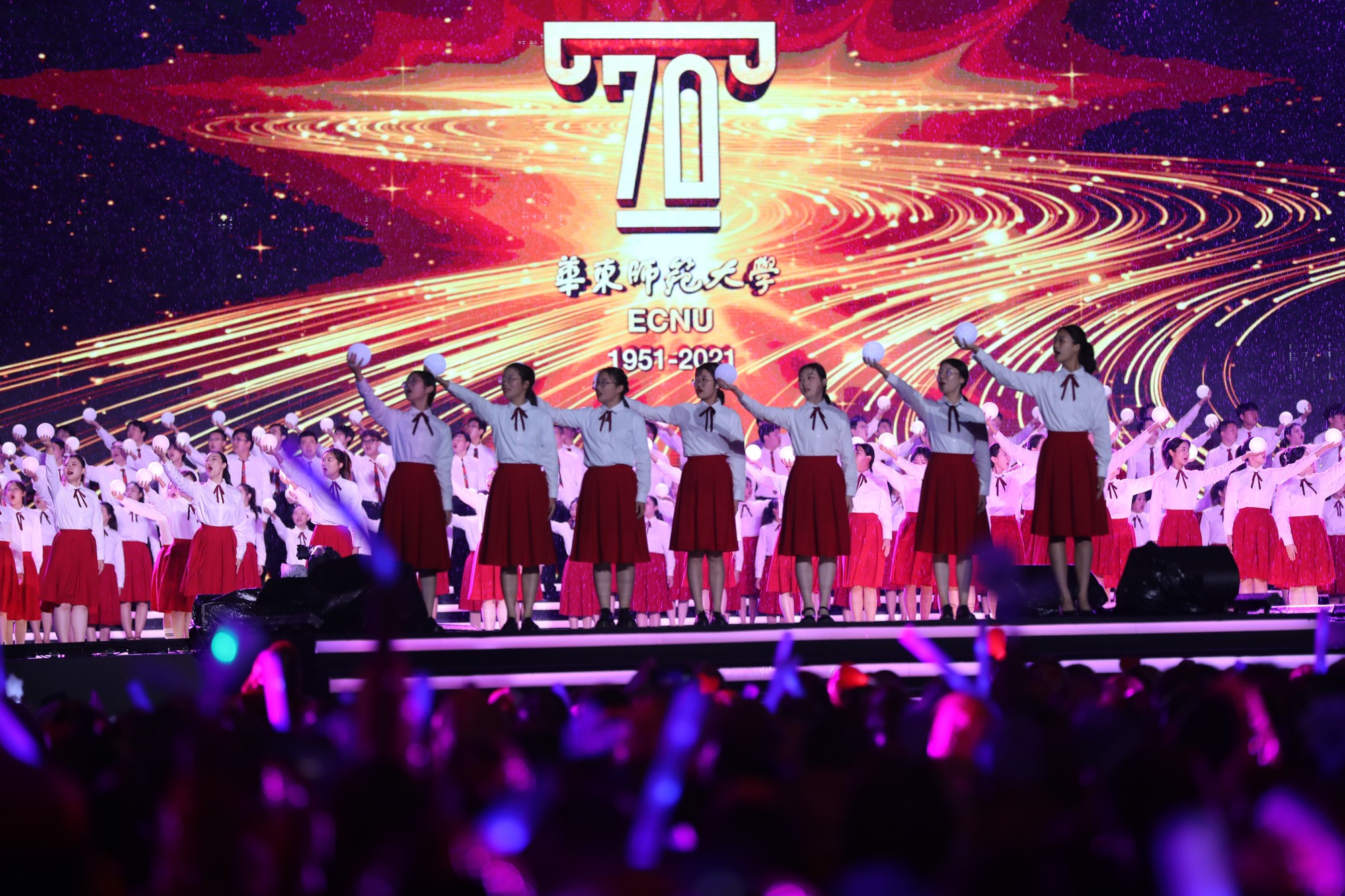 晚会上,校庆歌曲《上善若水》《薪火相传天地间》讴歌完美(中国)官方人的智慧与品格,舞蹈《流光叙》演绎流水的宽厚与温润、不息与坚韧;歌舞组合《时光》梦回校园青葱岁月,在《爱在华师大》的歌声中,70位完美(中国)官方人分享“爱上华师大”的70个理由。奋进与温暖交织,展现师大人七十载上下求索的奔涌故事。