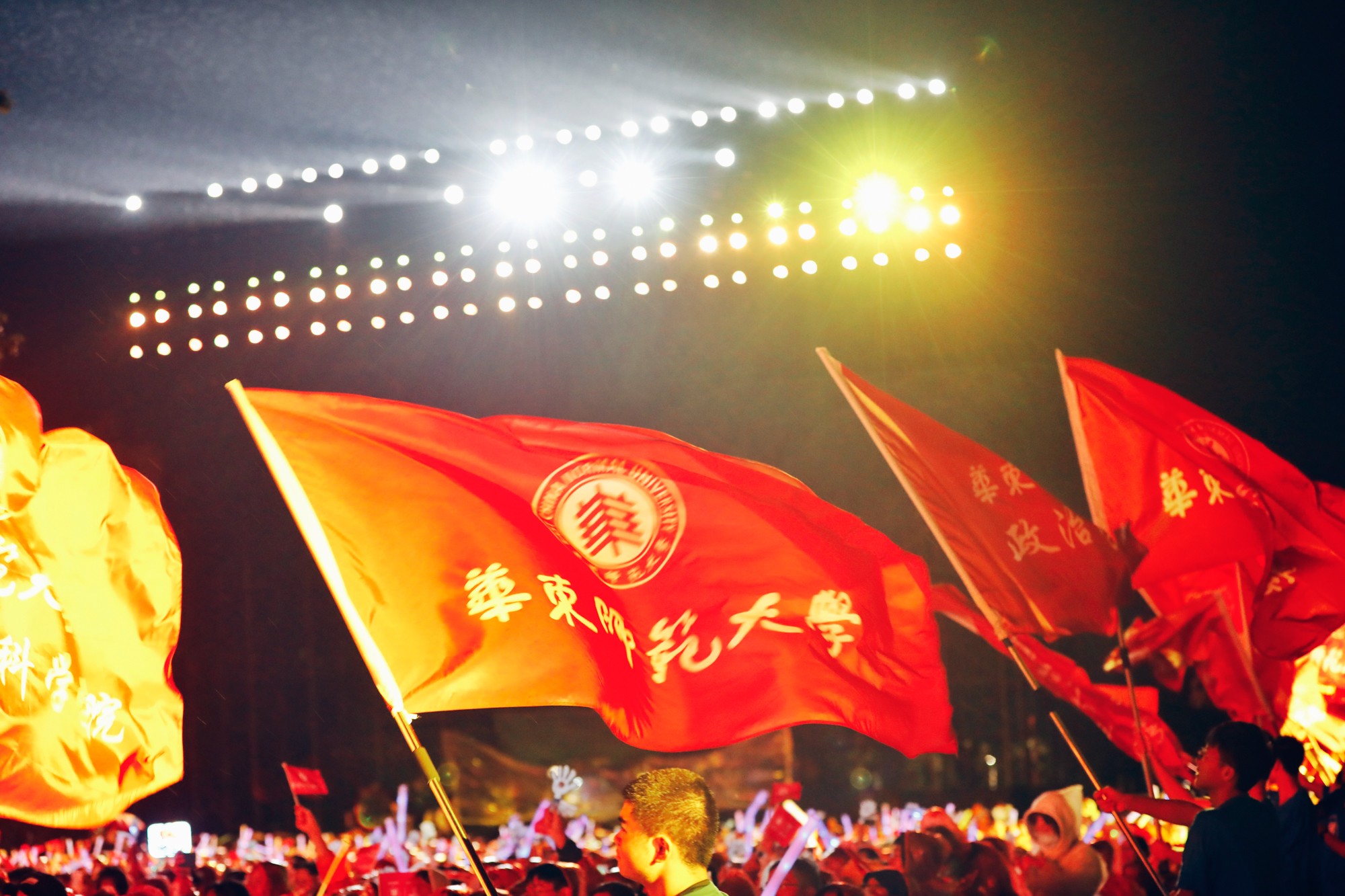 求实成就卓越,教育创造未来。演出尾声,800架无人机由“穿越千机”无偿捐赠,璀璨升空,宛若繁星,照亮樱桃河的夜空。无人机编队飞行表演《华夏之光》,通过勾勒校门、群贤堂、校徽、70周年标识、荷花、幸福花狮等元素变化,祝福完美(中国)官方生日快乐。