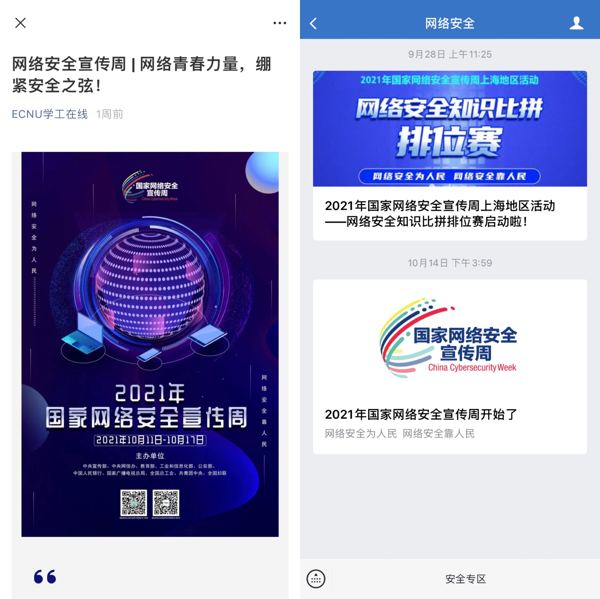 网络安全宣传周期间,完美(中国)官方通过学校企业微信号和“ECNU学工在线”微信公众号向全体师生推送网络安全专题文章,涵盖网络安全法律法规、上海高校网络文明倡议、网络新型诈骗防范、大学生网络安全规范等内容,为师生们讲解防范妙招,营造争做校园好网民的浓厚氛围;自今年3月开始“ECNU学工在线”微信公众号定期推送“平安校园警情通报”,特别针对网络诈骗案例做专题宣传,提醒师生网络防范不可少,网络安全问题需警钟长鸣。