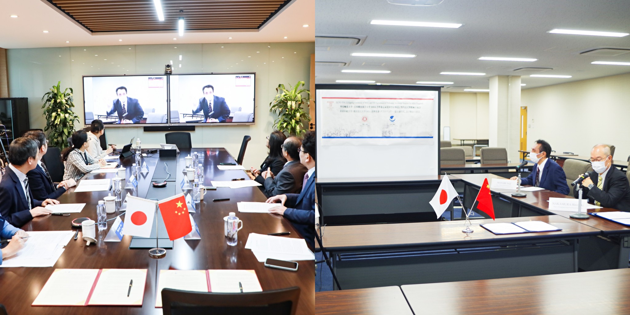 仪式致辞之后,蓝发钦教授作为学校及学部代表,中村博之教授作为日方代表,以云端签约的特殊形式签署了2021工商管理硕士(MBA)项目合作备忘录及双学位协议,再续两校友好合作情谊。两校出席领导、教师也在各自会场以云合影的特别方式见证了代表两校友谊长存的重要时刻。