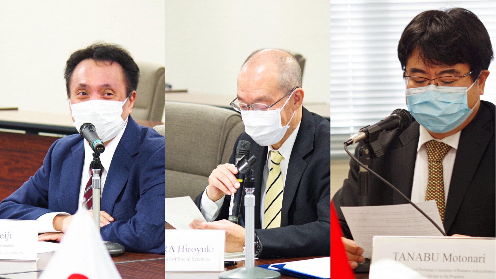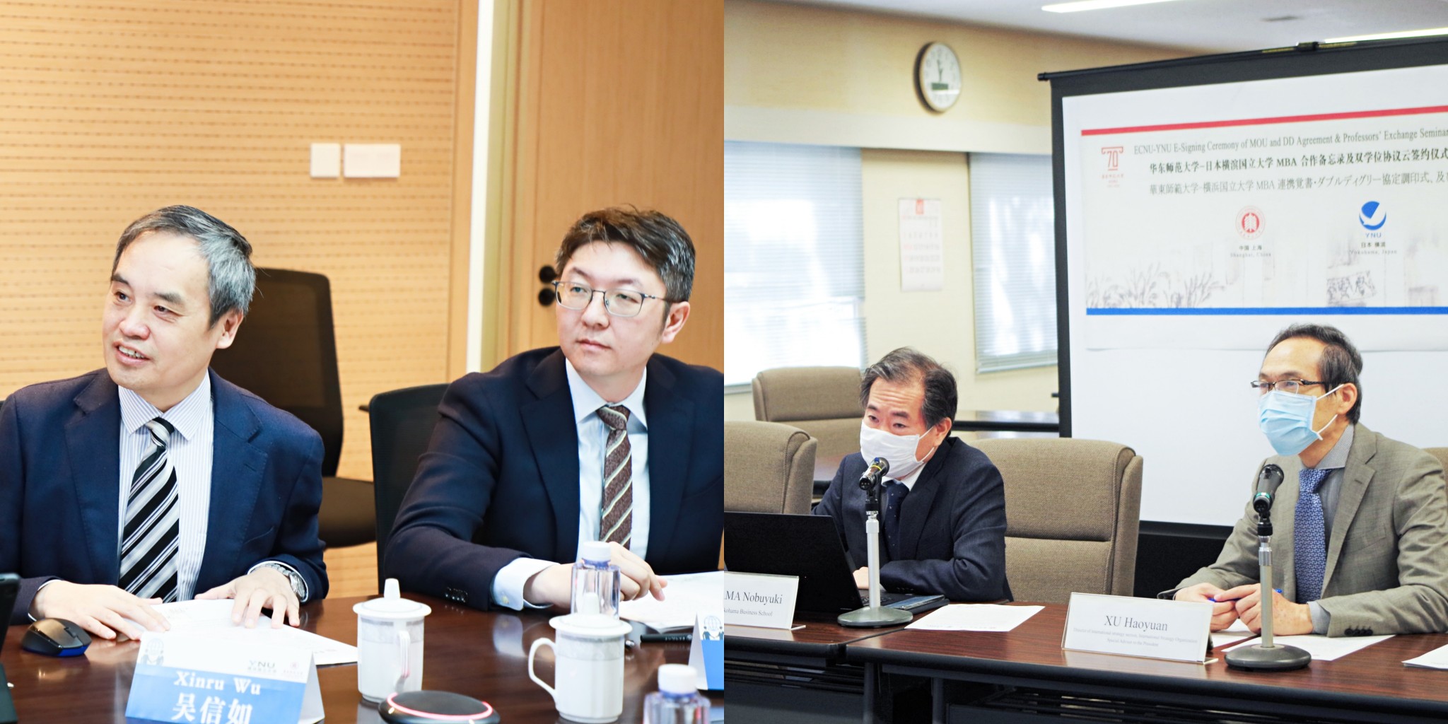 横滨国立大学国际社会科学研究院院长中村博之教授,工商管理学院院长、国际社会科学研究院工商管理系主任真锅诚司教授,校长顾问、工商管理学院国际交流委员会主任田名部元成教授,国际战略推进机构、规划推进部主任、校长特别顾问徐浩源教授,国际社会科学研究院前山政之教授,校长特别顾问森田洋教授出席云签约仪式横滨国立大学会场,并通过线上平台与我校全程云端同步连线。