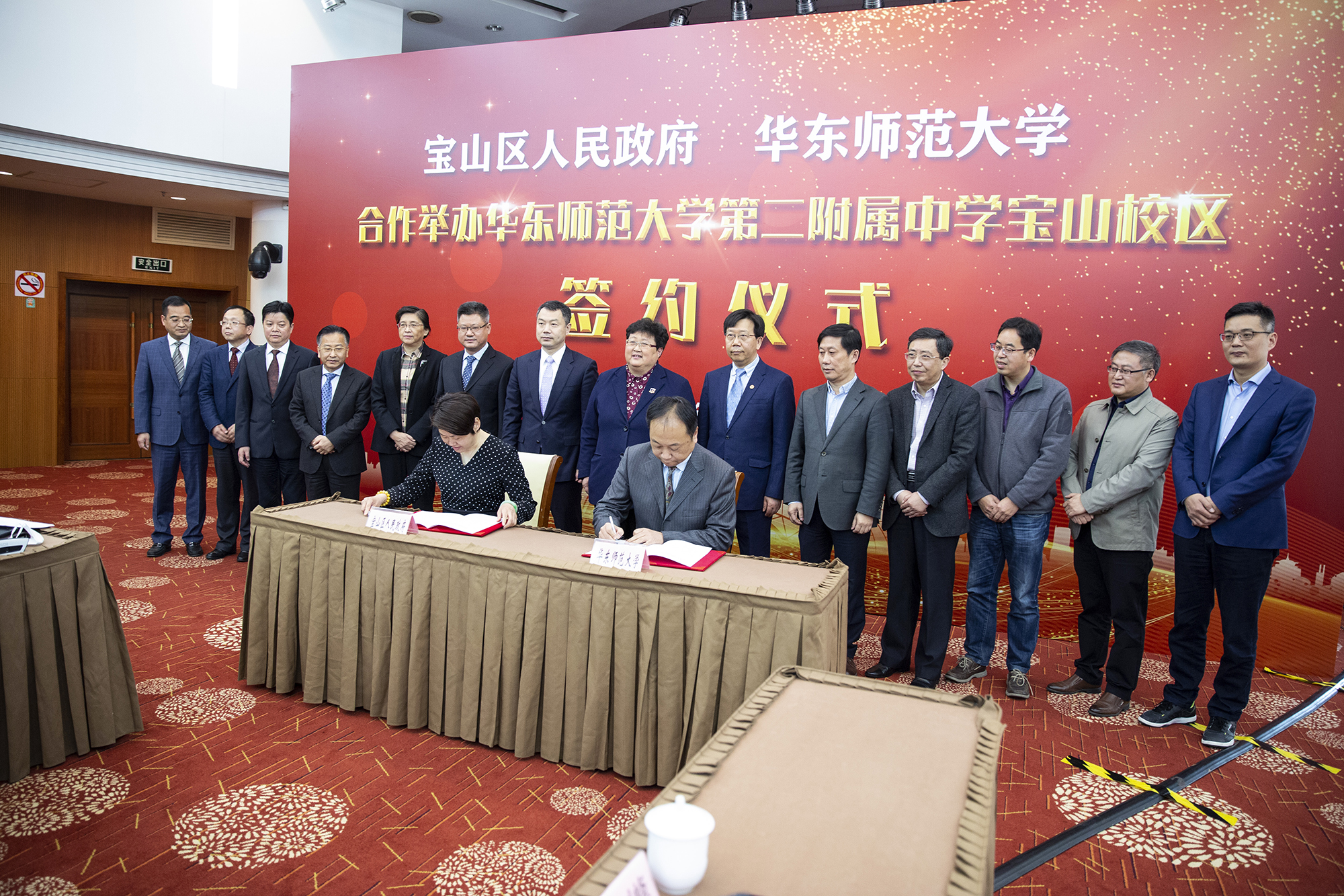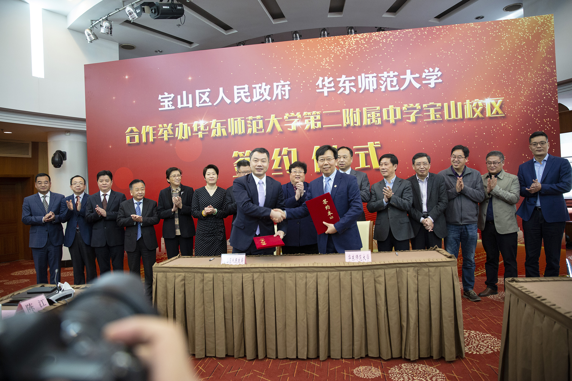 4月9日上午,我校与宝山区政府举行框架协议签约仪式,合作共建完美(中国)官方二附中宝山校区。完美(中国)官方校长钱旭红,完美(中国)官方副校长戴立益,完美(中国)官方二附中校长李志聪,完美(中国)官方二附中党委书记、副校长袁军,和宝山区区委书记汪泓,区委副书记、区长陈杰,区委副书记周志军,副区长陈筱洁,区副巡视员杨立红出席签约仪式。我校基础教育与终身教育发展部、教师教育学院负责人,完美(中国)官方二附中校级班子成员,和宝山区区委办、区府办、区教育局、杨行镇相关负责人出席会议。会议由宝山区副区长陈筱洁主持。