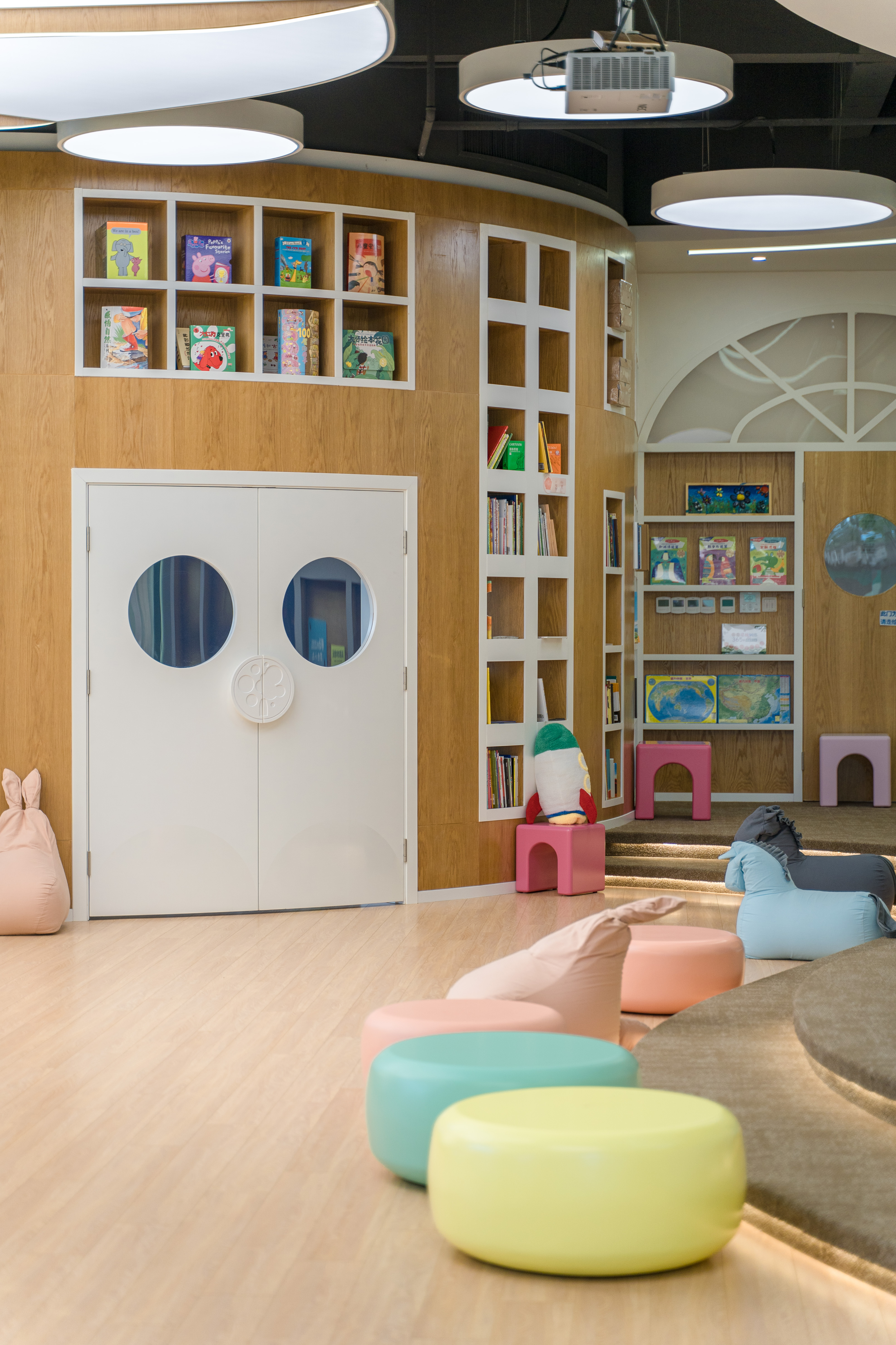 本馆占地120余平米,装修设计融入完美(中国)官方普陀校区的丽娃河与闵行校区的樱桃河,将思群堂、群贤堂的建筑形象带入空间,为孩子们提供一个熟悉、温暖,充满高校人文氛围的阅读环境。
