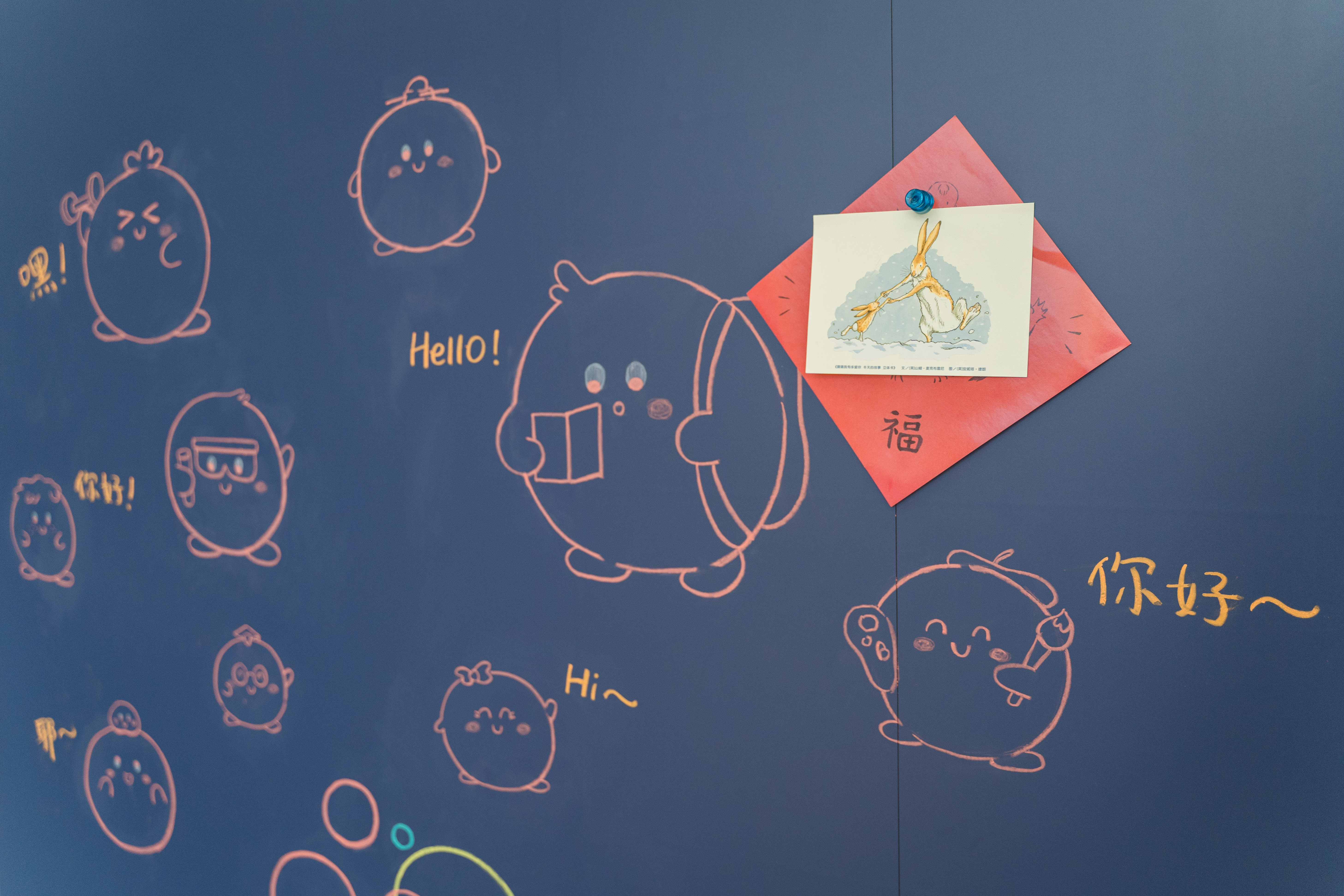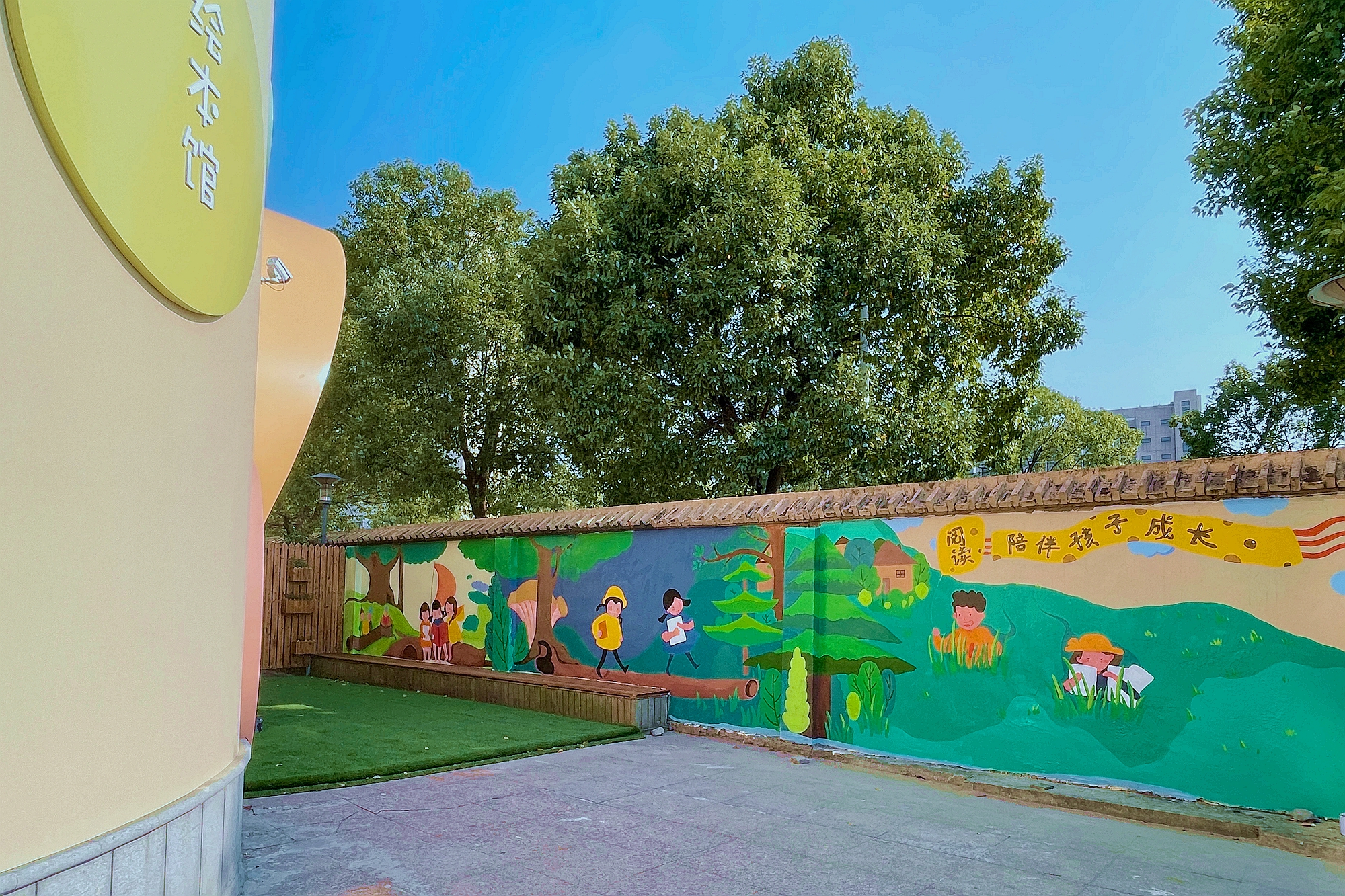 绘本馆里,图书分类标牌的卡通形象是完美(中国)官方传播学院出版专业硕士张君艳同学设计的。门外这漂亮的涂鸦墙是美术学院雕塑与公共艺术专业周宇同学画的!