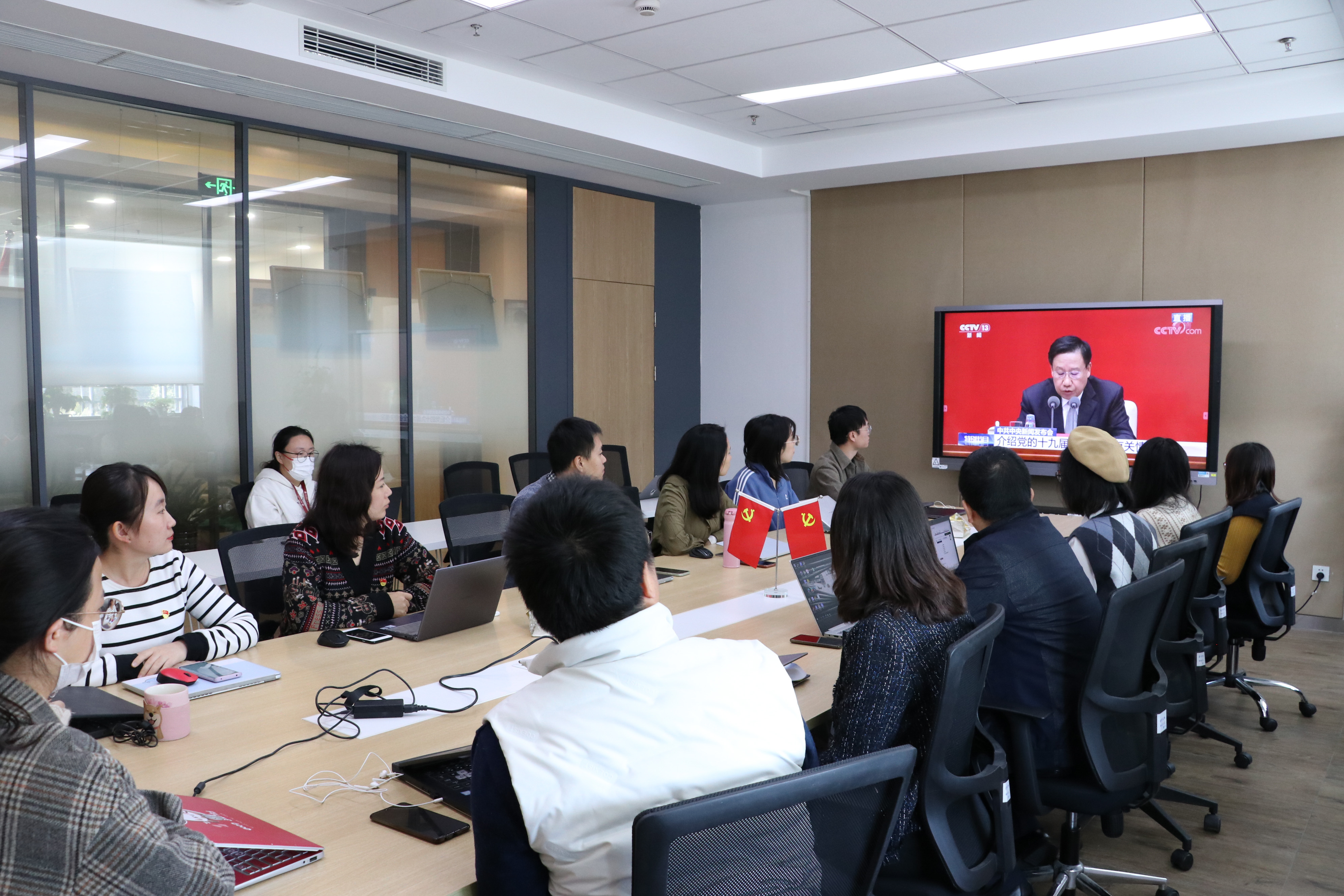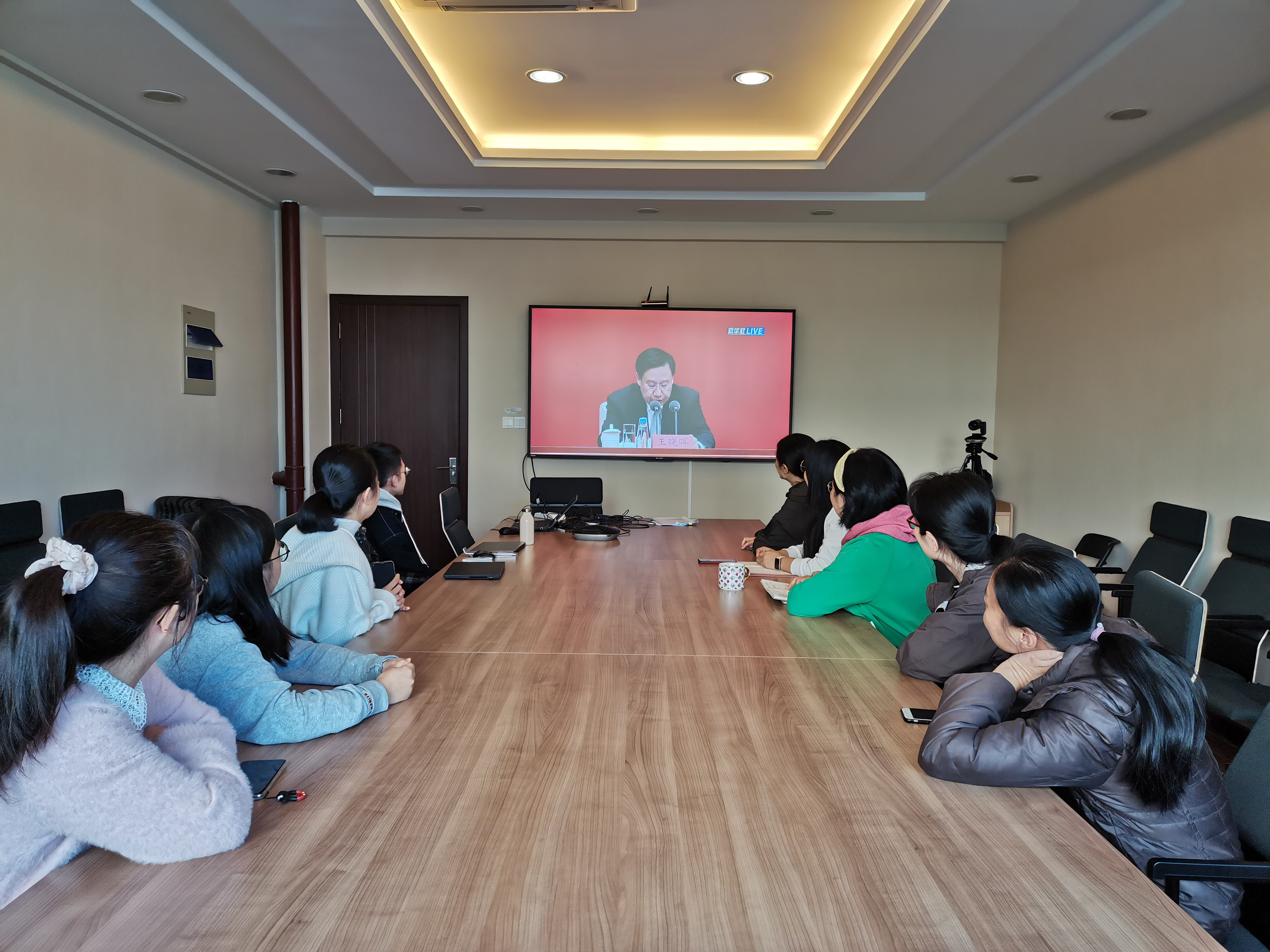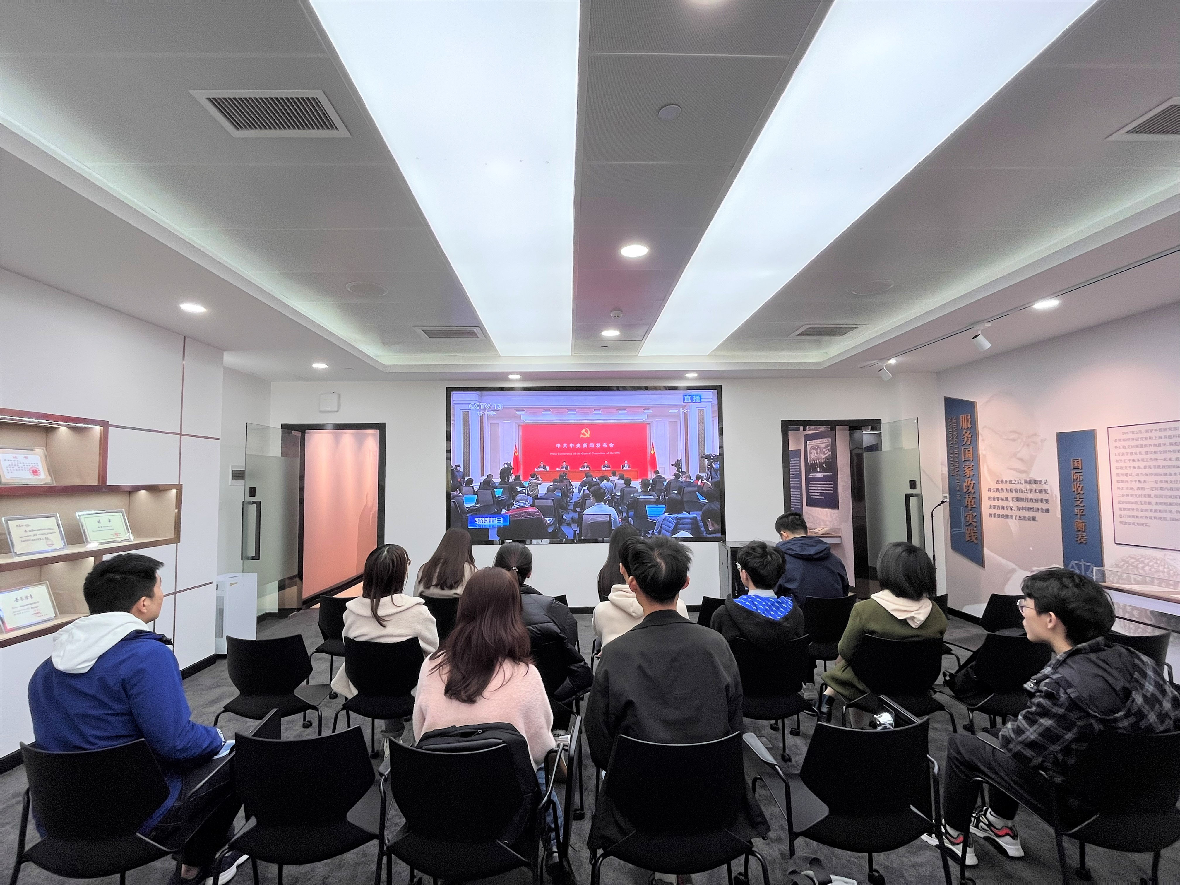 学习会上,与会人员集体观看了《新闻联播》专题报道以及人民日报新媒体推出的微视频《赶考路》。